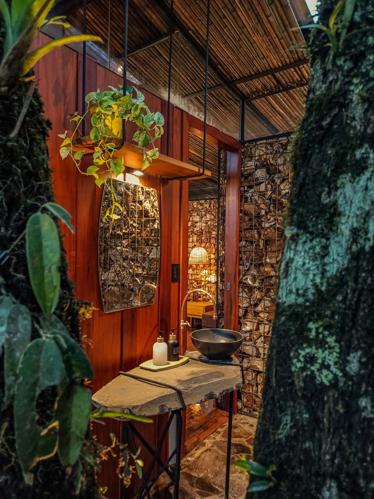 Bồn rửa mặt đặt ngoài trời với bàn đá thô, chậu sứ tối màu và tường gỗ, tạo cảm giác gần gũi thiên nhiên. Ảnh: Archdaily