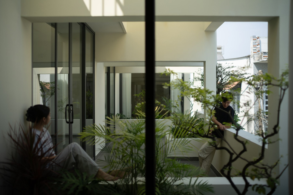 Thay vì lấp đầy diện tích bằng những mảng tường đặc, ngôi nhà chọn “khoảng rỗng” làm hạt nhân, như một nhịp thở len lỏi giữa những khối bê tông san sát. Ảnh: Quang Dam