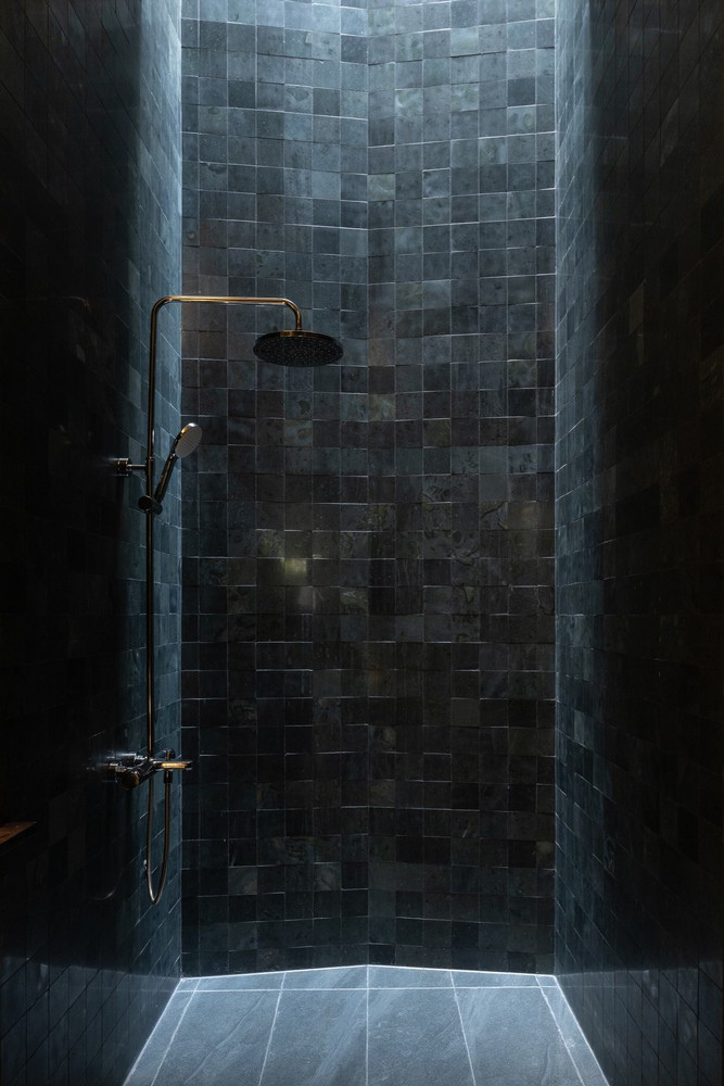 Về vật liệu, đá tự nhiên tông màu tối được sử dụng làm vật liệu hoàn thiện chính, gợi cảm giác vững chắc và bền bỉ. Ảnh: Quang Dam