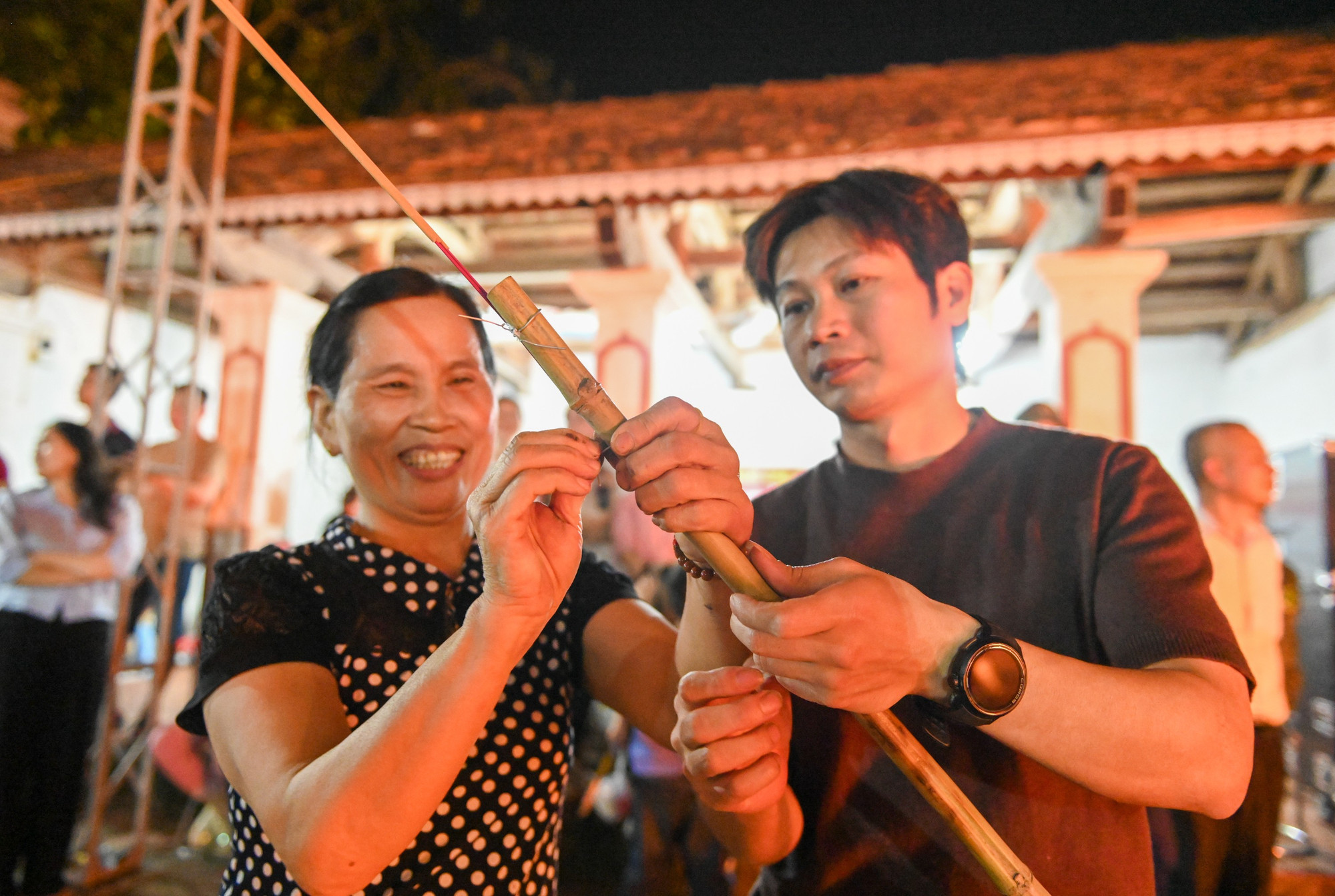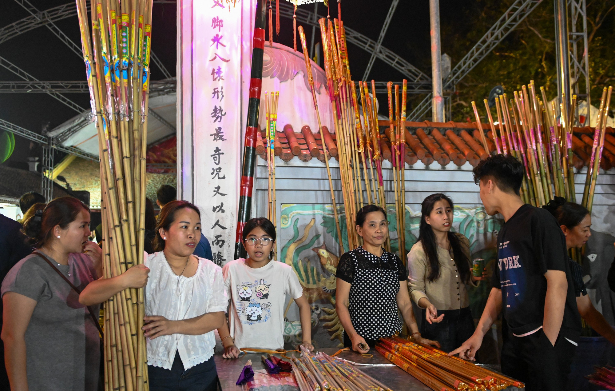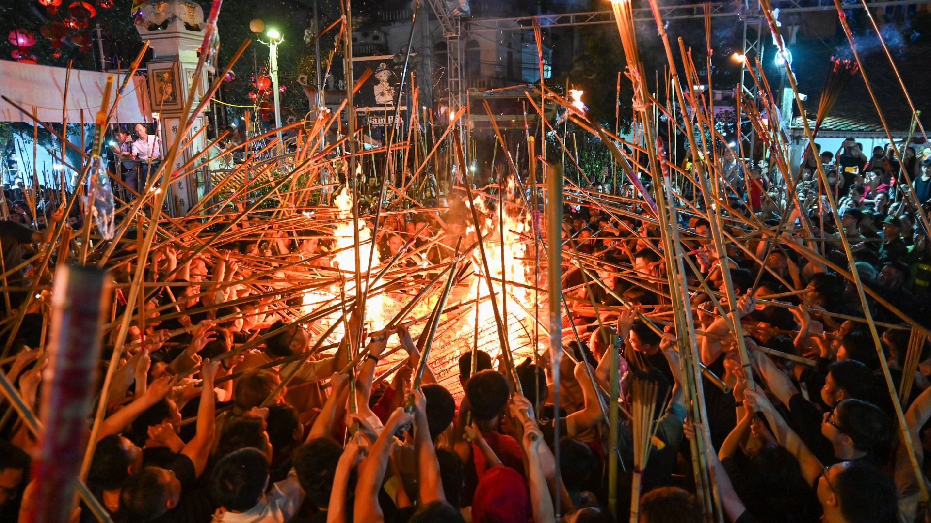 Từ rất sớm, người dân đã chuẩn bị những bó hương được gắn trên sào tre để xin lửa.