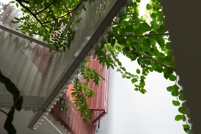 Dựa trên hình khối bất thường của khu đất, kiến trúc sư phủ lưới thép ngoài mặt tiền, tạo thành một vùng đệm đô thị và cho phép ánh sáng ban ngày len lỏi vào bên trong. Ảnh: Quang Đạm