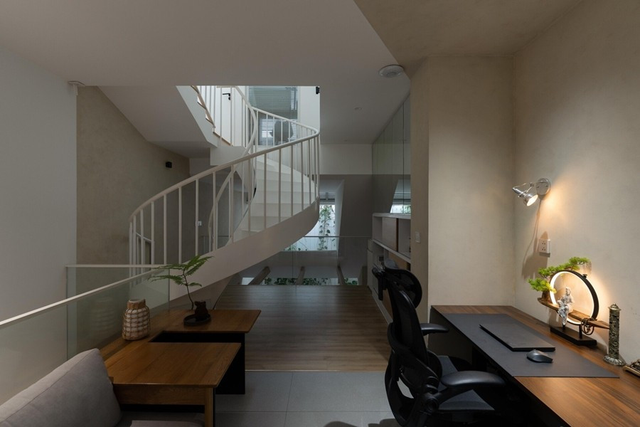 Tầng hai là phòng khách và được kết nối bằng cầu thang uốn cong, tạo sự chuyển động mềm mại cho không gian. Ảnh: Quang Đạm