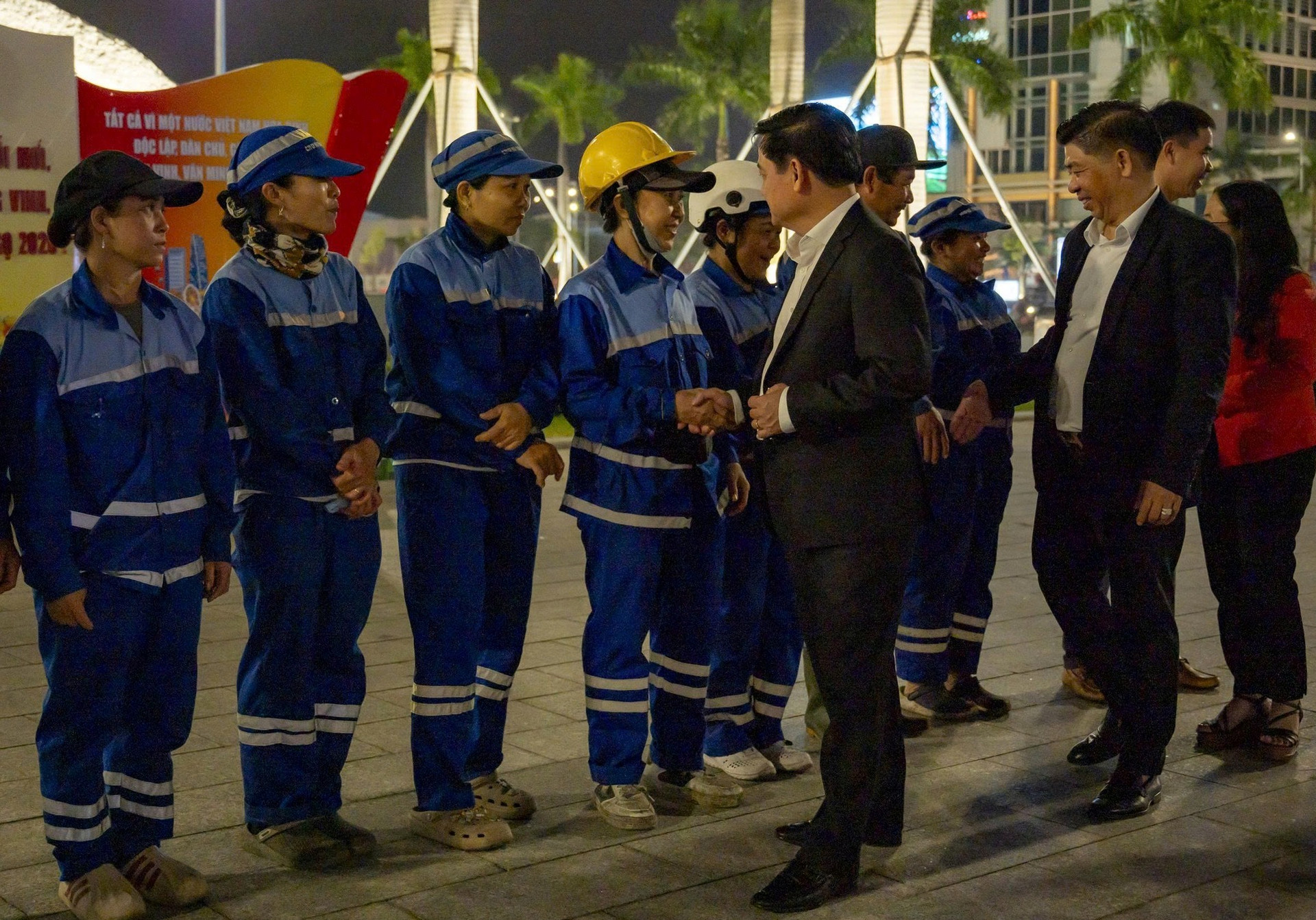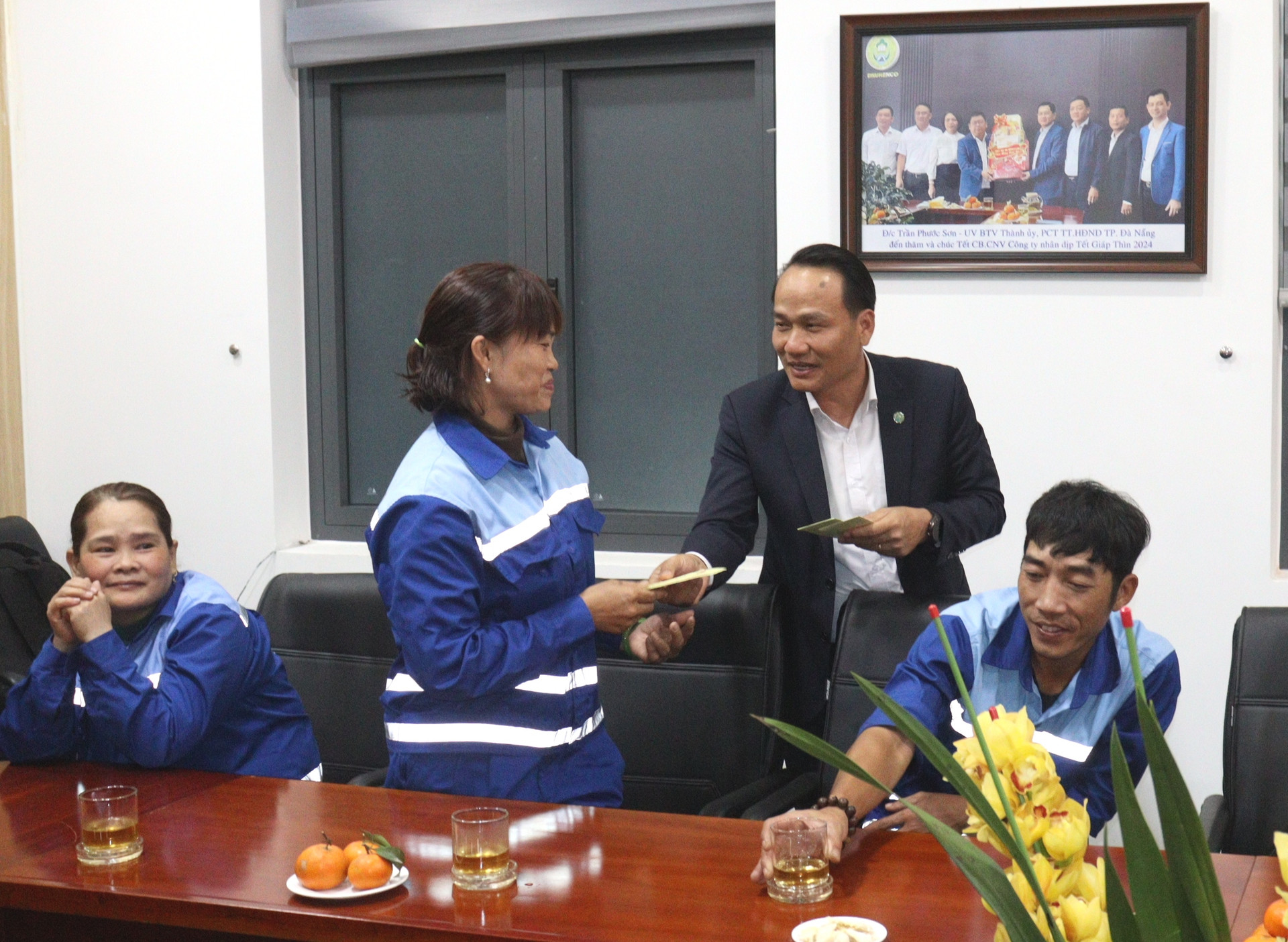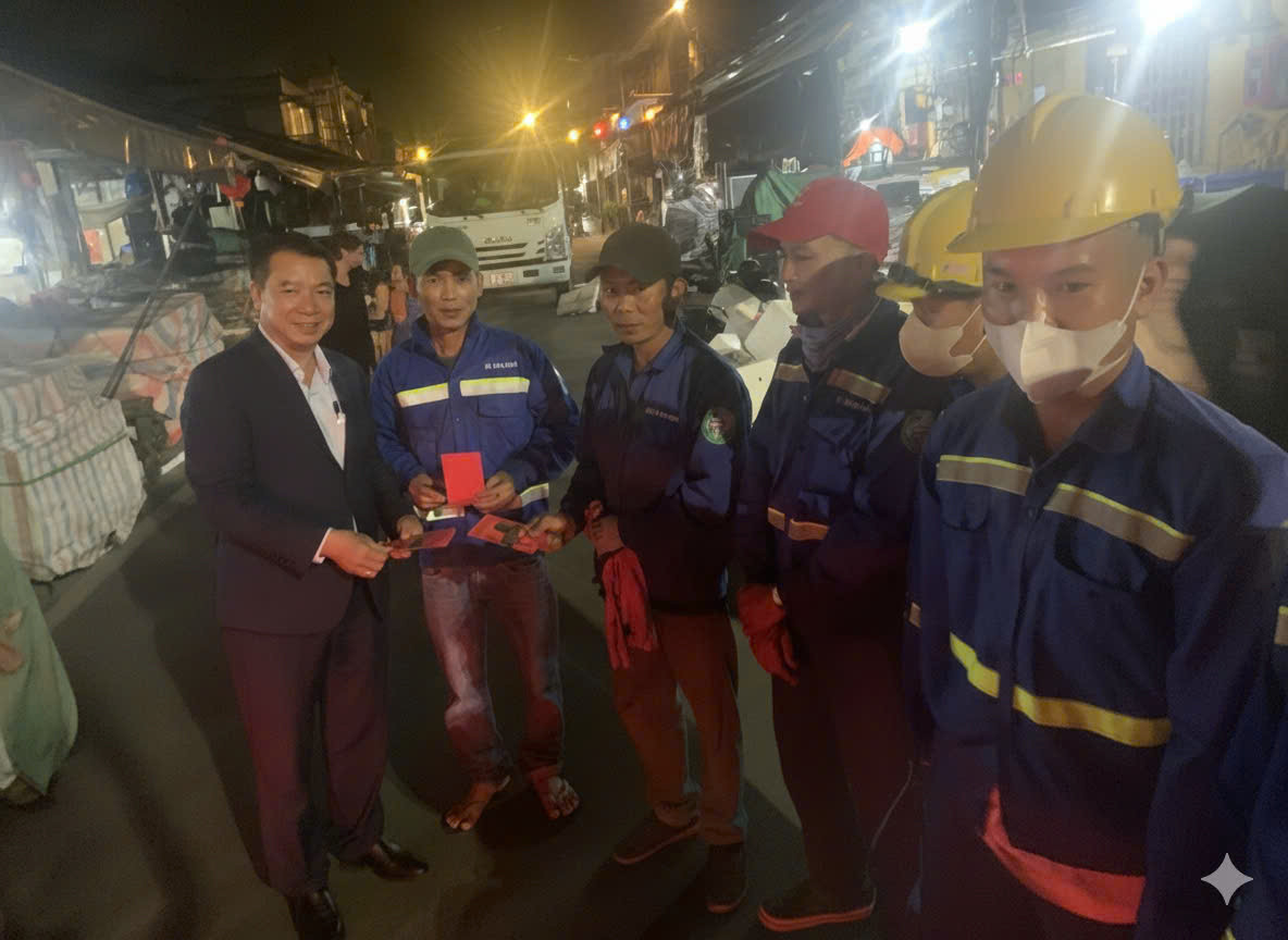 Trong đêm giao thừa, có 5 công nhân được Công ty CP Môi trường đô thị Đà Nẵng mời lên nhận lì xì từ Phó Bí thư Thường trực Thành ủy Đà Nẵng Nguyễn Đình Vĩnh.