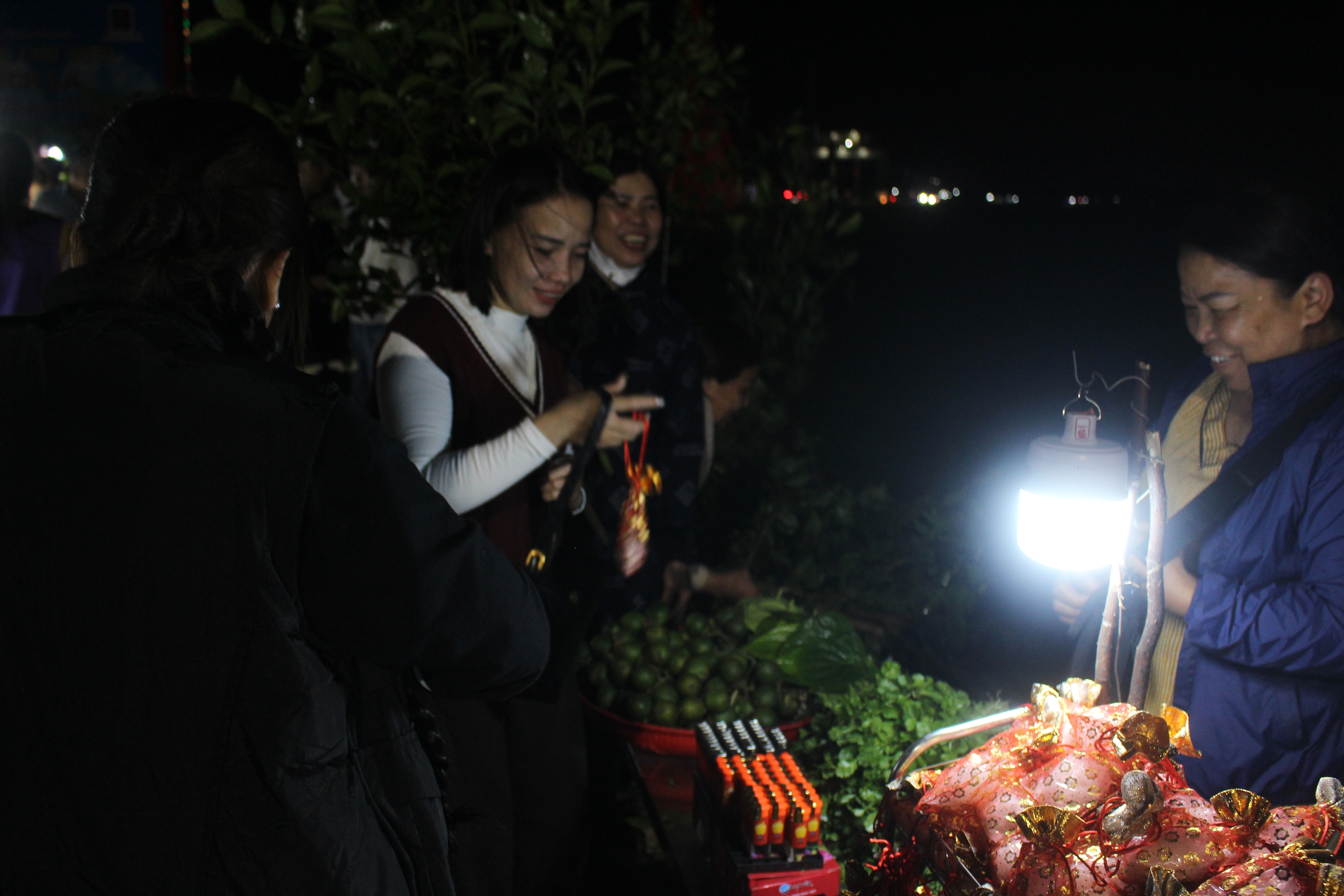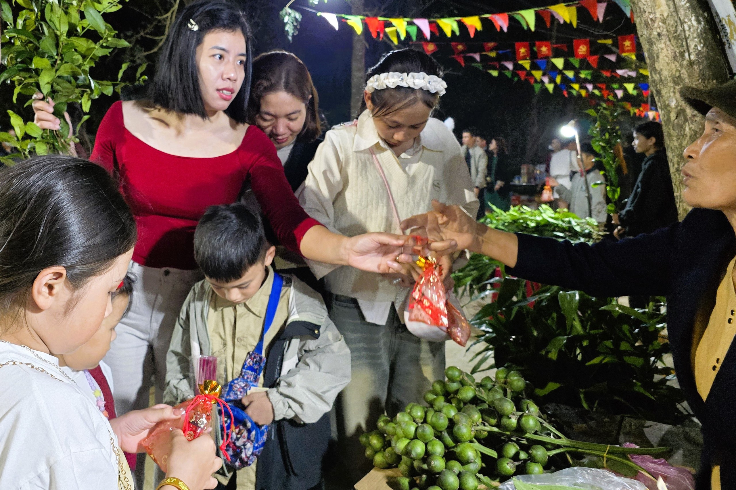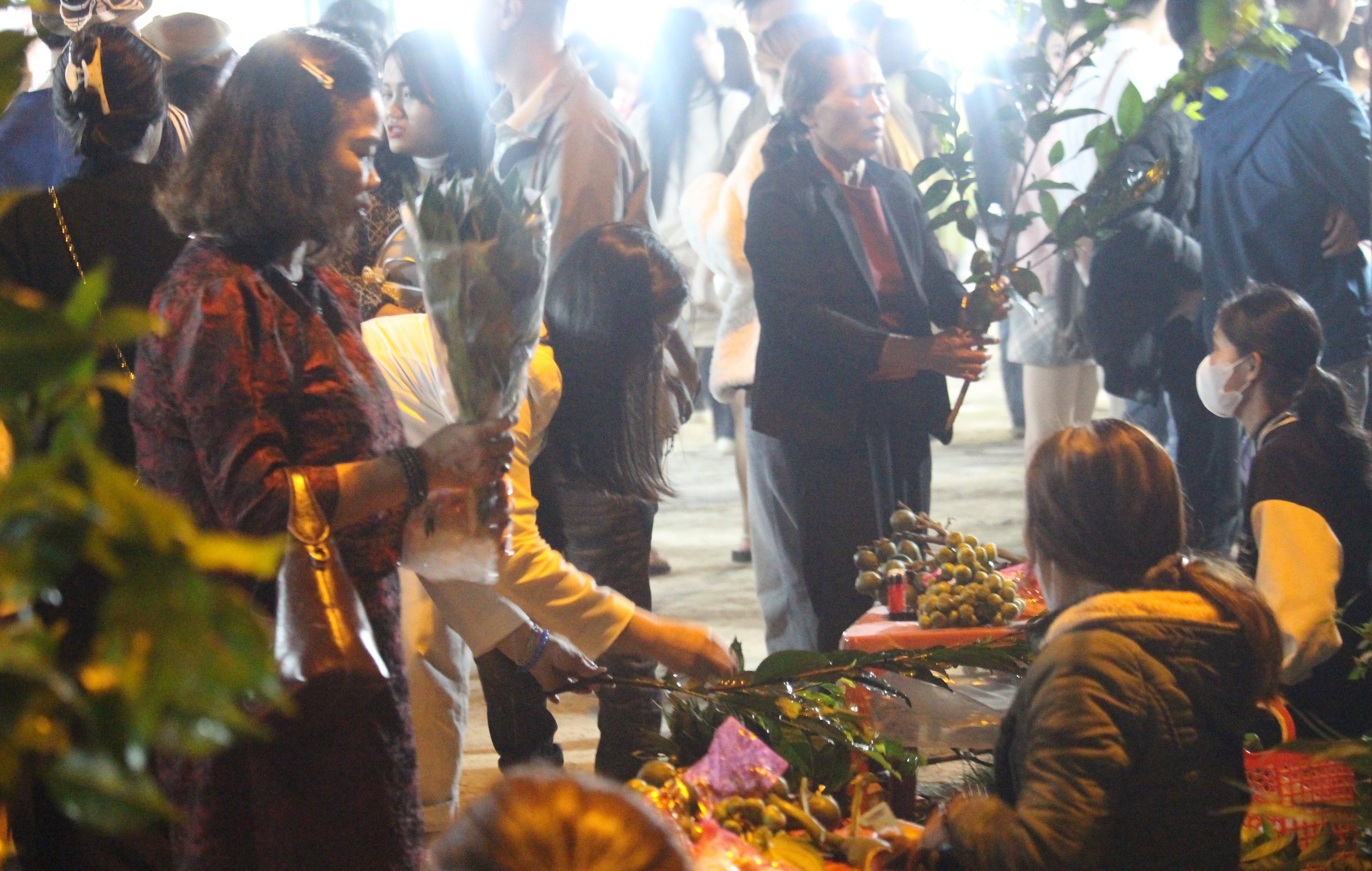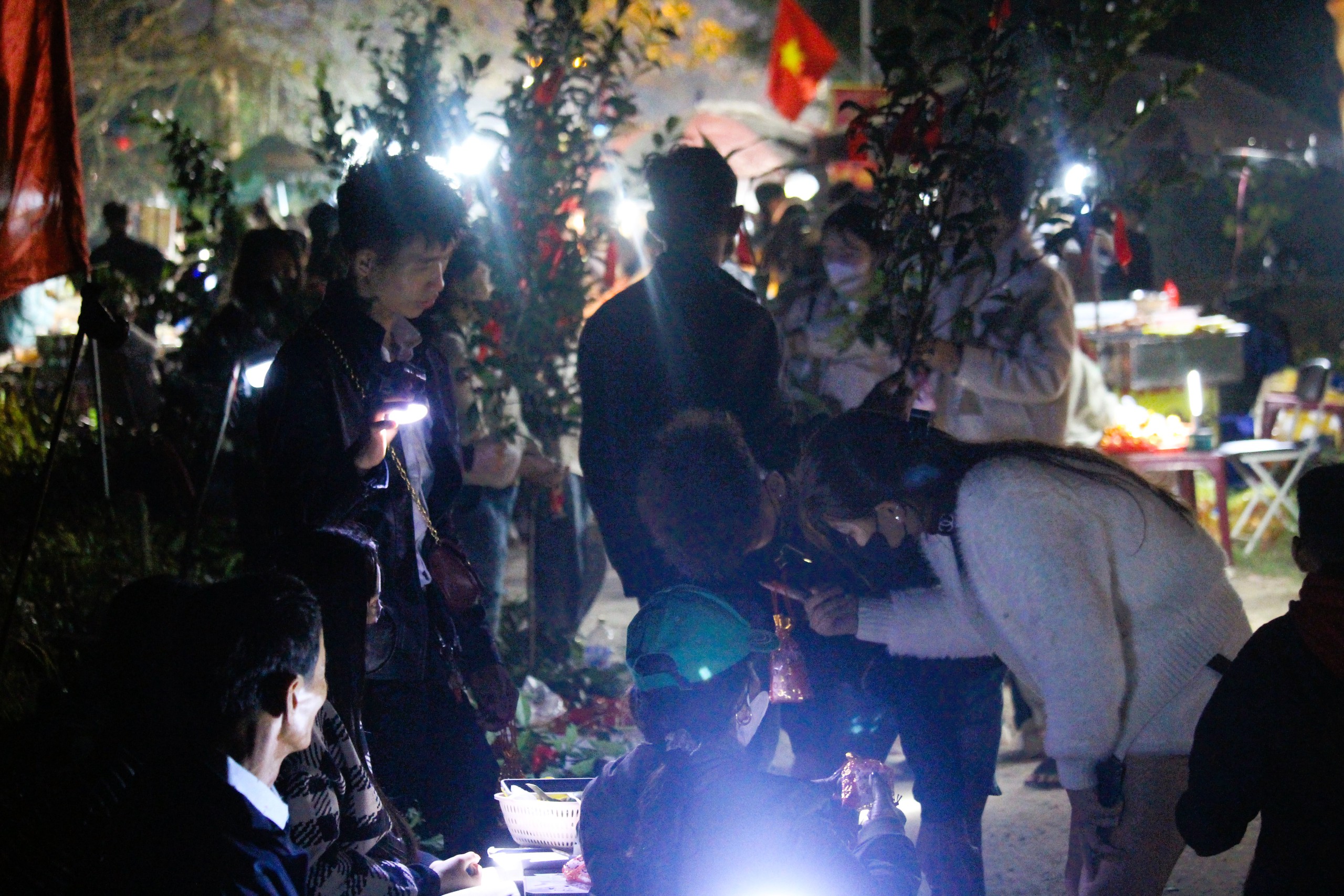 Gần 23h tối mùng 2 đến rạng sáng mùng 3 Tết, dòng người khắp nơi đổ về đông nghẹt, các nẻo đường vào lễ hội chợ đình chộn rộn tiếng người bán chào mời khách mua cơi trầu, bịch muối, cành “lộc” đầu năm.