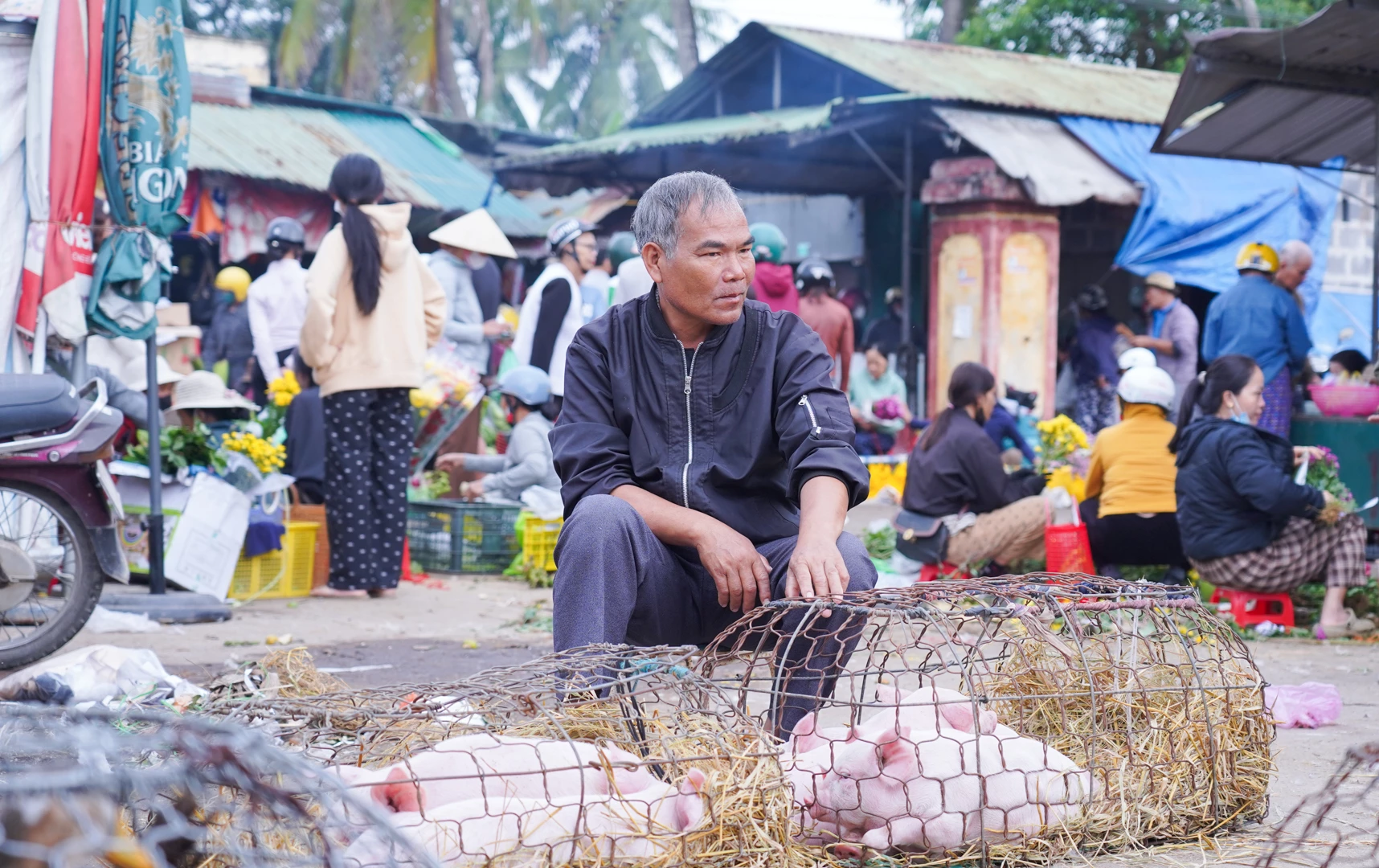 Nét riêng có ở chợ Phiên Cam Lộ là người dân bày bán cả lợn giống, gà và nhiều vật nuôi khác - Ảnh: L.T