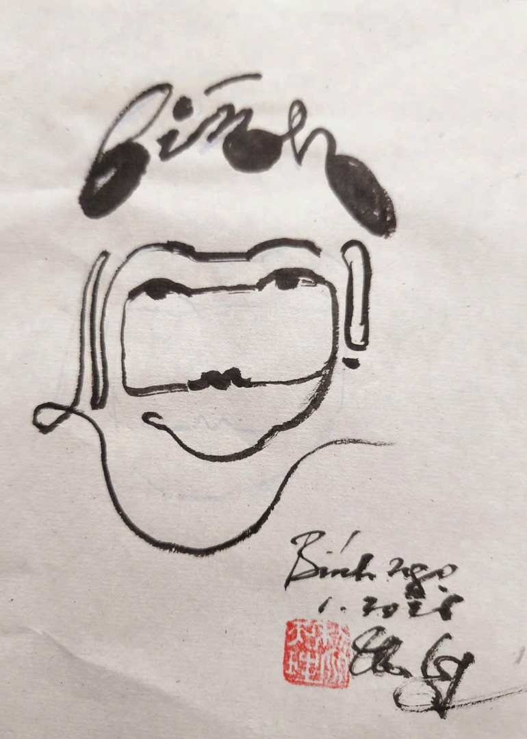 Chỉ vào bức thư pháp hình con ngựa, ông Lý chia sẻ cách sắp xếp các chữ cái trong chữ Bính Ngọ sao cho khéo léo, hợp lý: chữ b là đầu và chân trước con ngựa, phần đầu chữ n là chân trước, kết hợp chữ inh và chữ n là phần thân ngựa và một chân sau; chữ ngọ là phần đuôi, mông và một chân sau ngựa. Khó nhất là đặc tả chân và đầu ngựa. Để viết được nhiều bức thư pháp nhanh, đẹp đòi hỏi cách bố cục hài hòa, luyện tập thuần thục, bàn tay điêu luyện, sáng tạo.