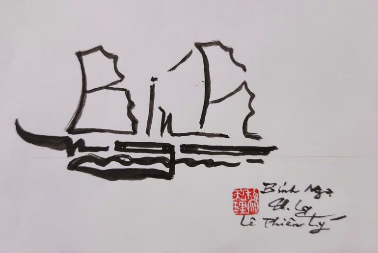 Bức thư pháp chữ Bính Ngọ hình con thuyền.
