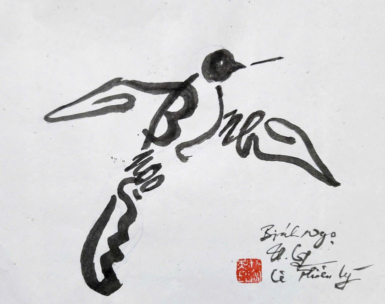 Bức thư pháp chữ Bính Ngọ hình con chim.