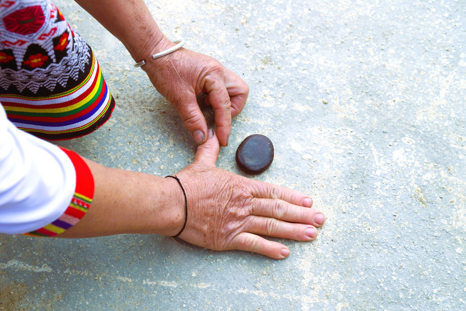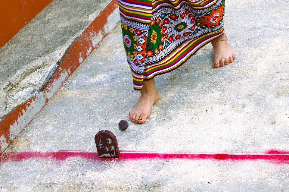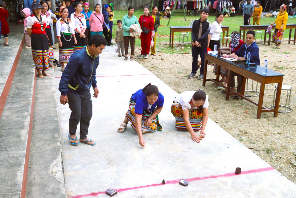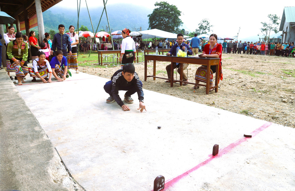 Người chơi dùng bàn chân hất hạt mặng để trúng và đổ được mẩu gỗ mục tiêu hình vảy cá ở vạch đích. (Ảnh: Xuân Tiến/TTXVN)