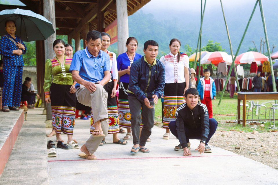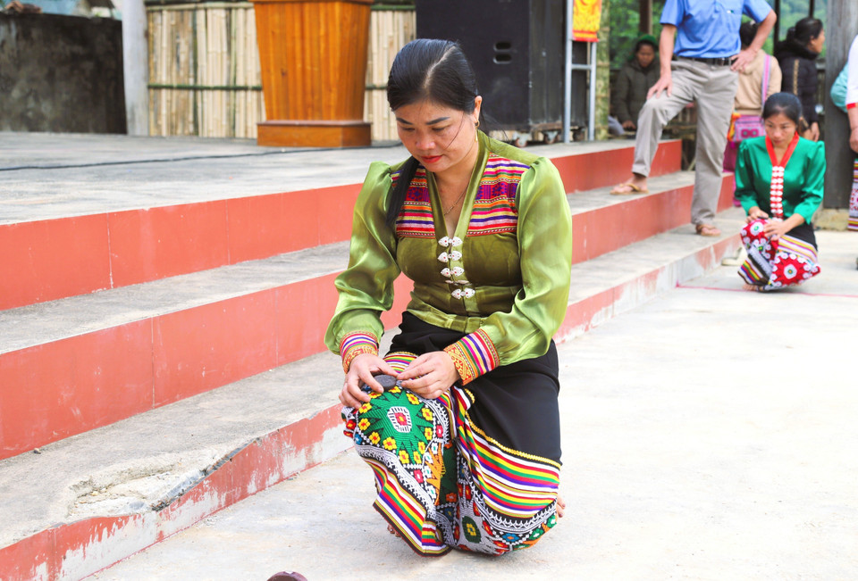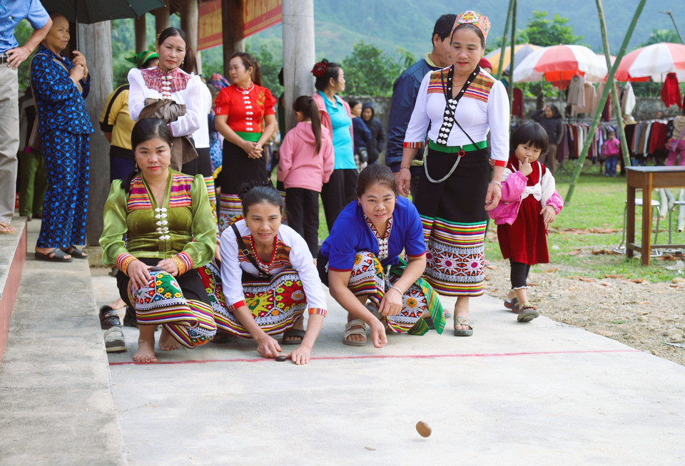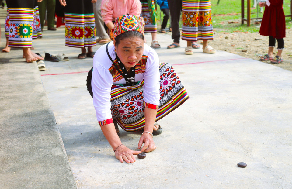 Phụ nữ Thái trong trang phục truyền thống tham gia chơi Tó mặng tại vạch xuất phát trong tư thế ngồi và quỳ bắn hạt mặng. (Ảnh: Xuân Tiến/TTXVN)