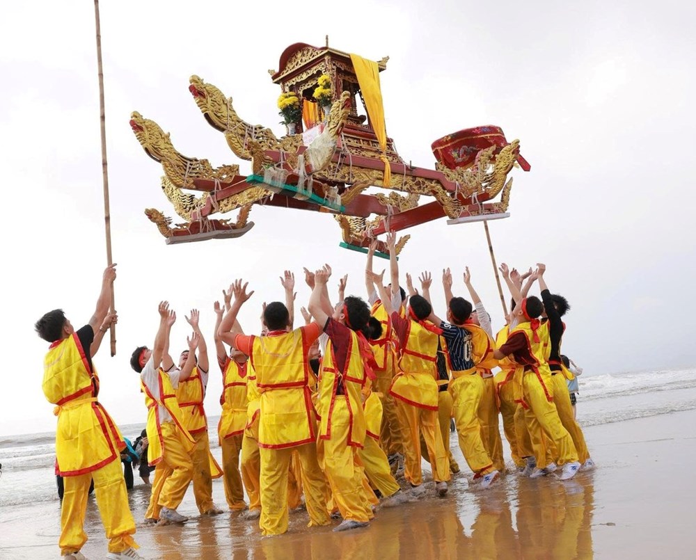 Đoàn rước sau đó tiếp tục di chuyển ra khu vực bãi biển để thực hiện lễ cầu ngư. Các mâm lễ được bày biện công phu với những lễ vật truyền thống như xôi gà, thủ lợn, rượu, bánh oản và hoa quả, thể hiện lòng thành kính của ngư dân đối với thần linh, cầu mong mùa biển thuận lợi.