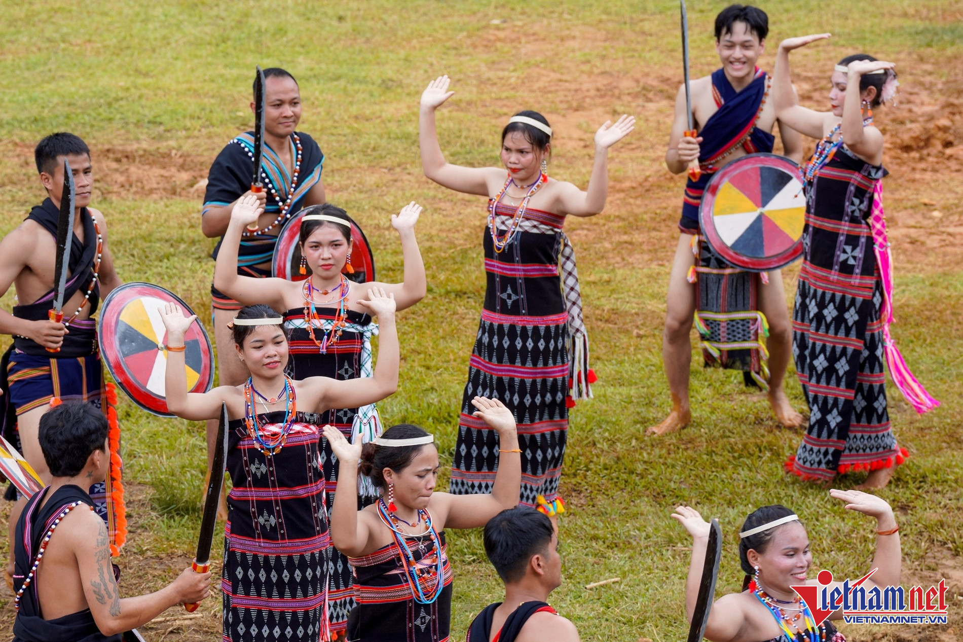 Trong âm vang cồng chiêng giữa sân làng, đàn ông Cơ Tu khoác khố, choàng áo thổ cẩm, tay cầm khiên hoặc giáo, bước đi dứt khoát, mạnh mẽ. Bên cạnh họ, những người phụ nữ trong váy thổ cẩm rực rỡ, cổ đeo chuỗi cườm, hai tay đưa ngang vai, lòng bàn tay ngửa ra sau như đón vật thiêng, ánh mắt nhìn thẳng, môi luôn mỉm cười.