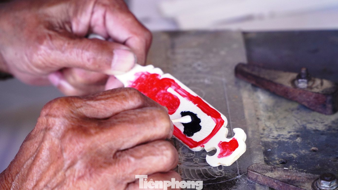 Dù tuổi cao, ông Tố vẫn tự tay làm gần như toàn bộ công đoạn. Từ việc ra chợ tìm mua xương bò, phơi khô, cắt xẻ, mài nhẵn, đến khắc chữ, khắc hình và tô màu. Theo ông, để hoàn thiện một bộ xăm hường đạt chuẩn phải mất khoảng hai tuần.