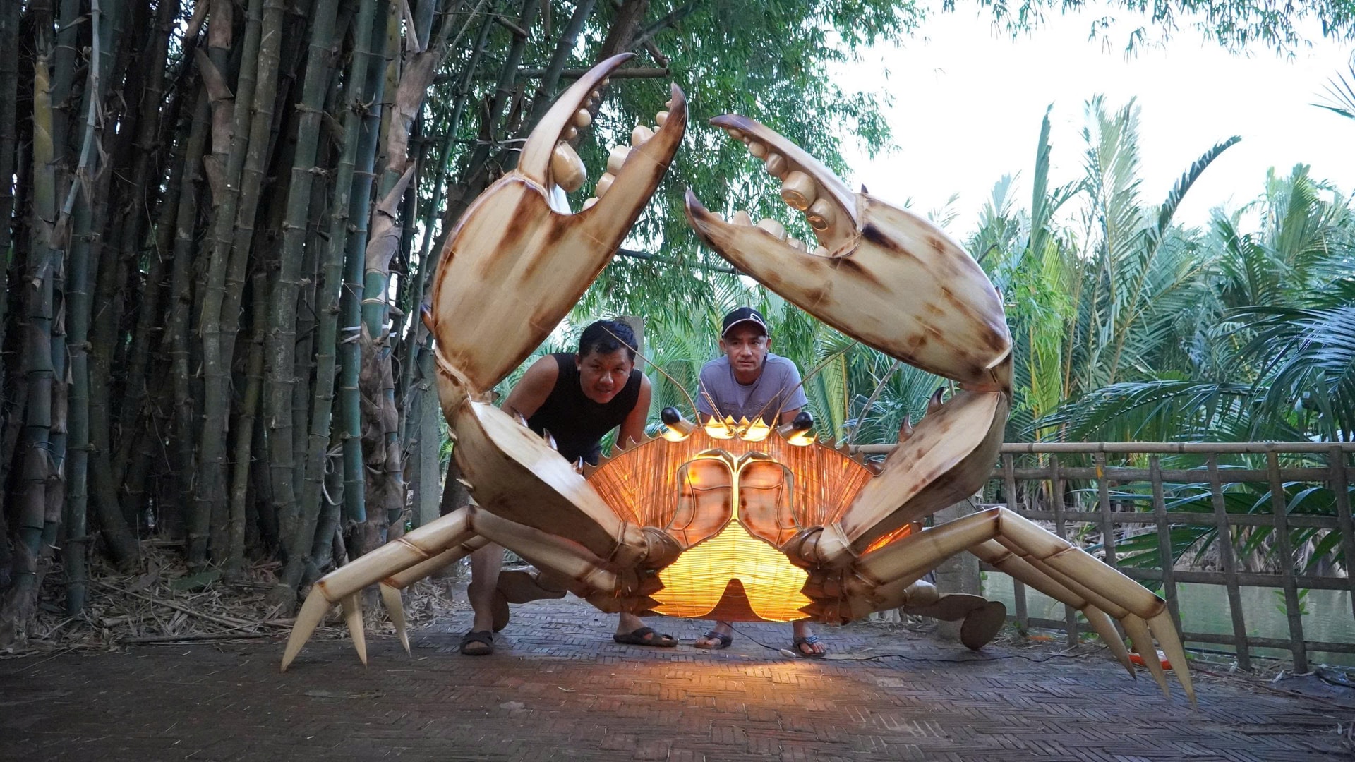 Ông Võ Tấn Tân (bên trái) và mô hình con cua khổng lồ bằng tre. Ảnh: TẤN CHÂU