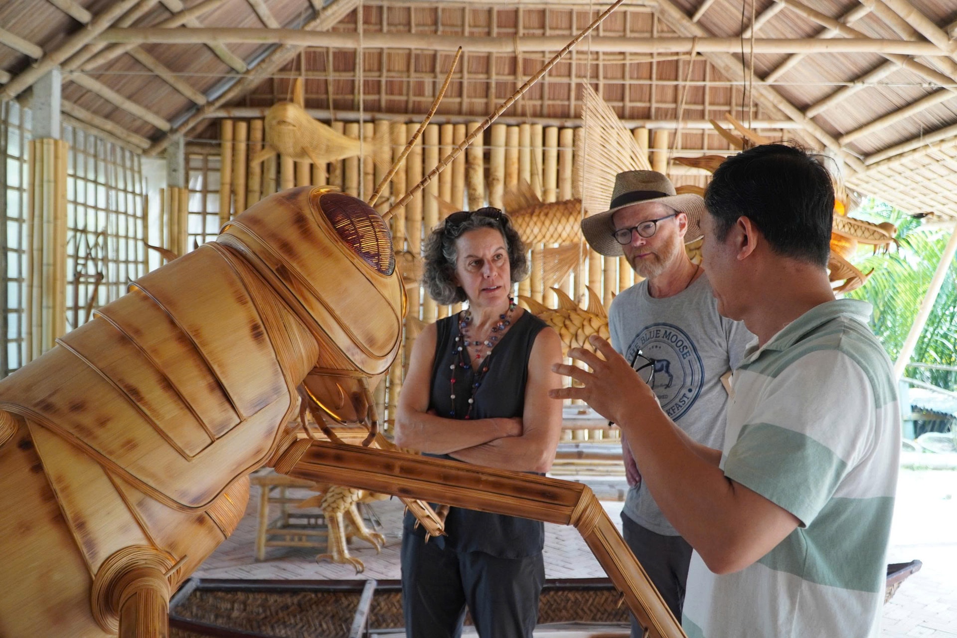 Khách quốc tế chăm chú nghe ông Tân thuyết minh về một mô hình sinh vật khổng lồ từ tre. Ảnh: HÀ SẤU