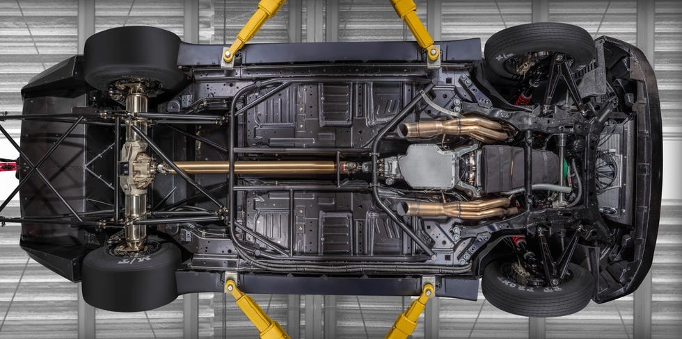 Các biện pháp giảm trọng lượng khác bao gồm khung phụ phía trước và cản va nhẹ, bảng điều khiển bằng sợi carbon, bộ căng dây đai phôi nhẹ, và trục truyền động bằng nhôm. Dù không có con số trọng lượng cụ thể, ước tính xe ở mức dưới 3.500 pound (khoảng 1.587 kg) để đáp ứng quy định của NHRA.
