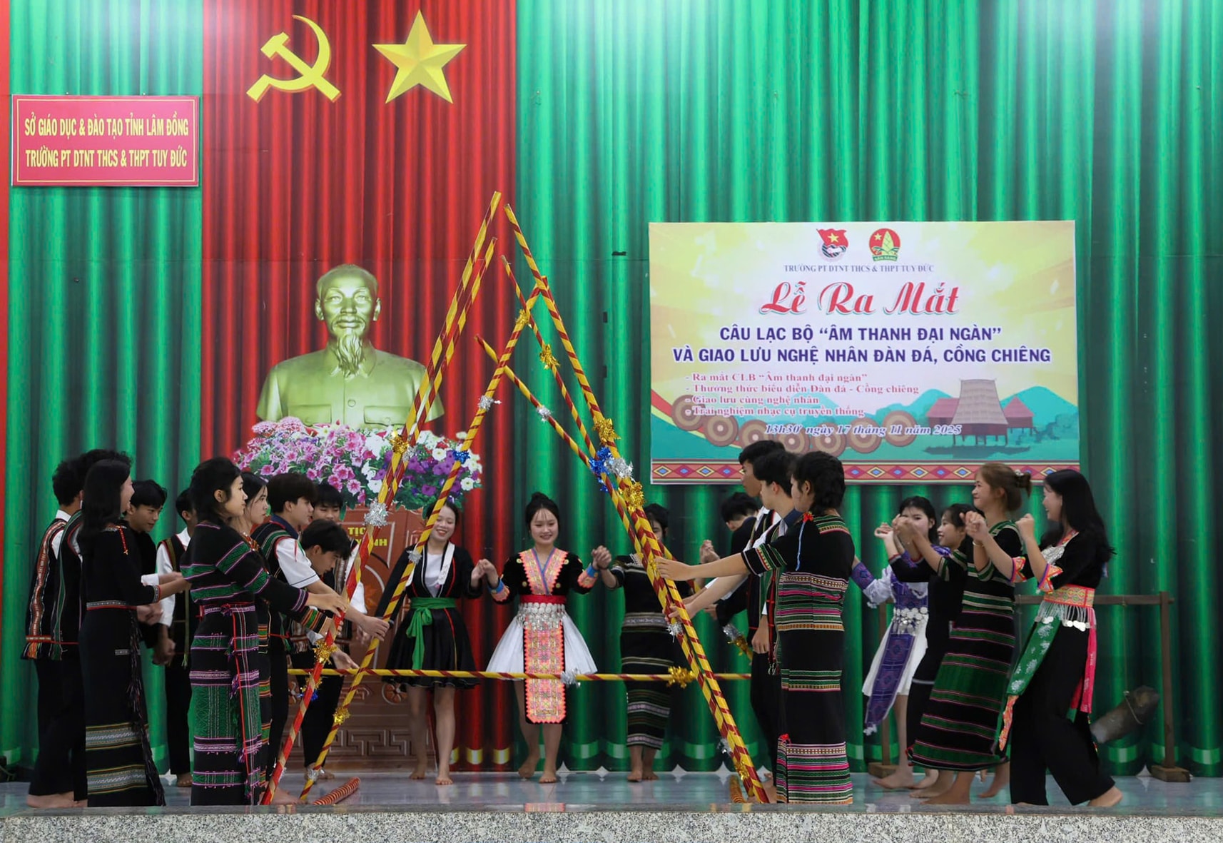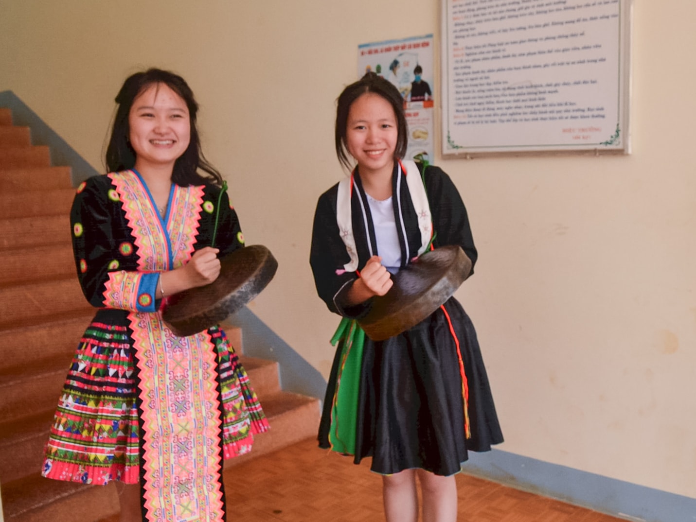 Em Vân (bên trái) và em Nhi tích cực tham gia đánh cồng chiêng cùng với "Câu lạc bộ Âm thanh đại ngàn" tập luyện tập, gìn giữ bản sắc văn hóa