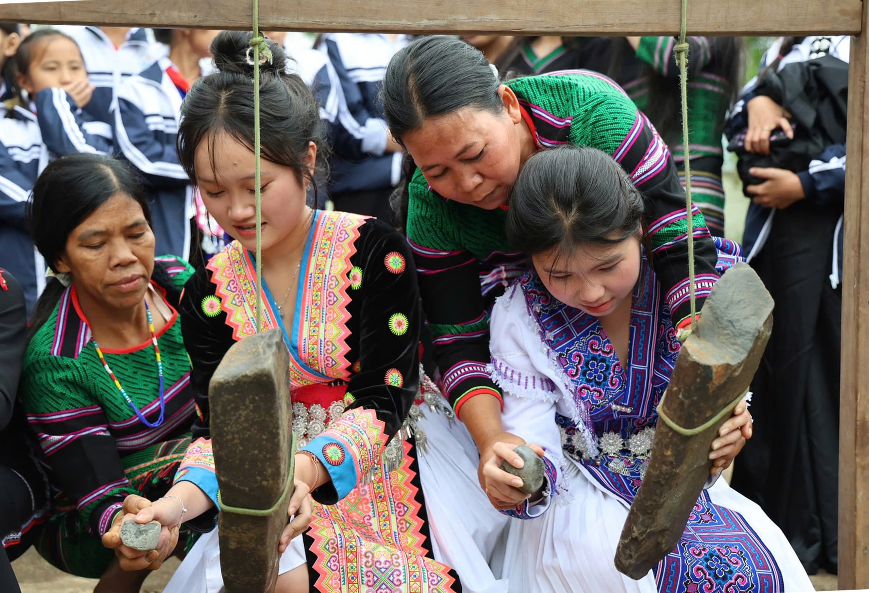 Lỳ Y Vân (thứ 2 từ trái sang) tập đánh đàn đá từ nghệ nhân