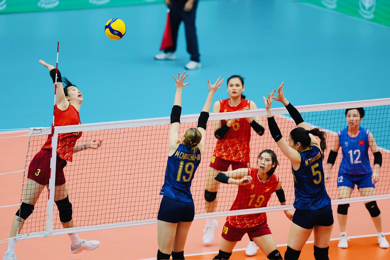 Hàng chắn của đội tuyển bóng chuyền nữ Việt Nam cản phá trước tay đập Thái Lan. Ảnh: DŨNG PHƯƠNG