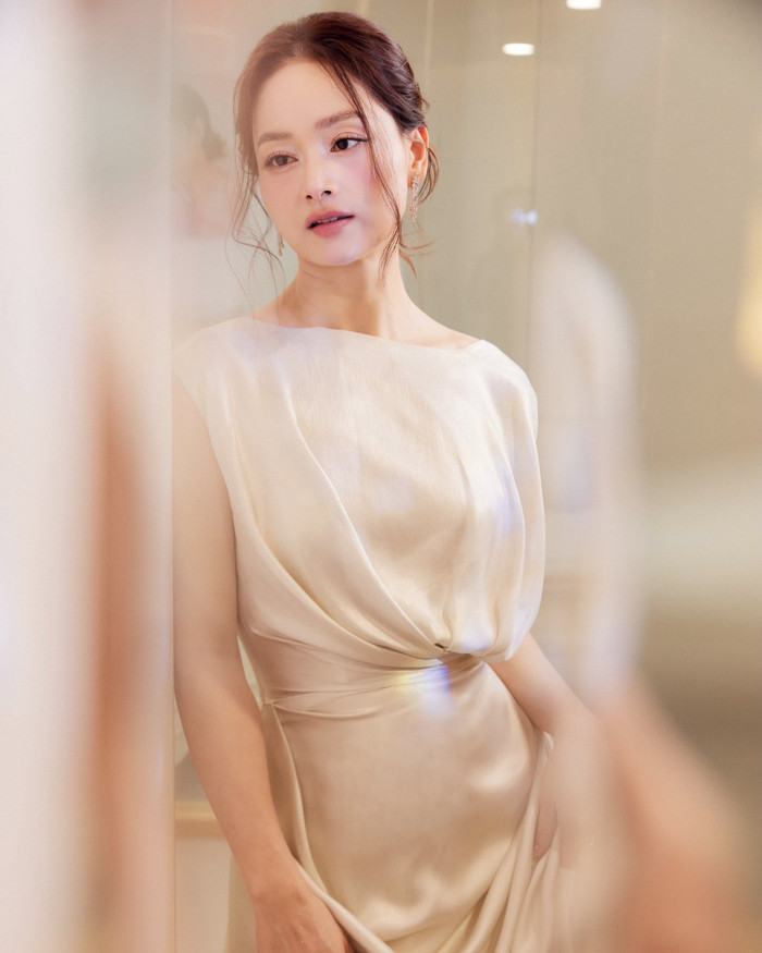 Khi phối cùng chiếc váy lụa satin màu trắng ngà có phần thân trên drapery bất đối xứng và tay áo rộng kiểu cape nhẹ, đôi bông tai mà Lan Phương lựa chọn càng phát huy hiệu quả thị giác. Tông màu lạnh của kim cương tạo độ tương phản tinh tế với chất lụa bóng mượt, đồng thời kéo dài tỷ lệ cổ và vai, giúp nữ diễn viên trông cao ráo và thanh thoát hơn. Ảnh: FBNV