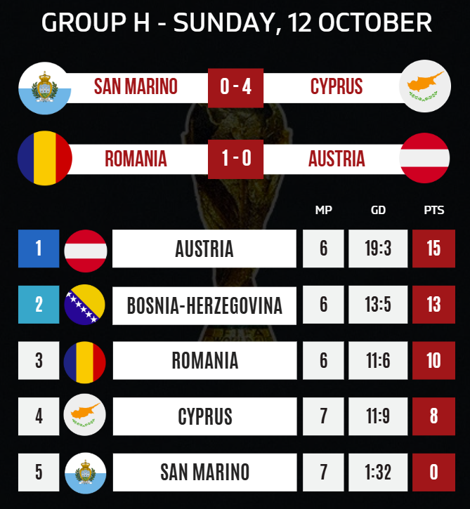 Romania (10 điểm) chỉ còn kém đội đứng thứ hai, Bosnia và Herzegovina, 3 điểm trên bảng xếp hạng. Nếu Romania thắng chính đối thủ ở lượt trận vào ngày 16/11 tới, họ sẽ san bằng điểm số với Bosnia và Herzegovina.