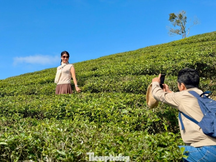 Đặc biệt, đứng giữa những hàng chè xanh rì, du khách có thể dễ dàng tìm thấy những góc chụp hình lý tưởng. Phông nền thiên nhiên hùng vĩ của miền cao nguyên mang đến cảm giác thư thái và những bức ảnh kỷ niệm ấn tượng.