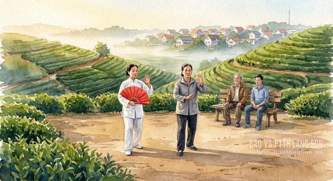 Ông Lâm dặn dò con trai vài câu quen thuộc rồi lặng lẽ quay về. Hai người đàn bà đứng song song, bắt đầu những động tác dưỡng sinh chậm rãi hòa cùng nhóm tập. Họ không nói gì, chỉ nhìn về phía mặt trời đang dần nhú lên sau núi.