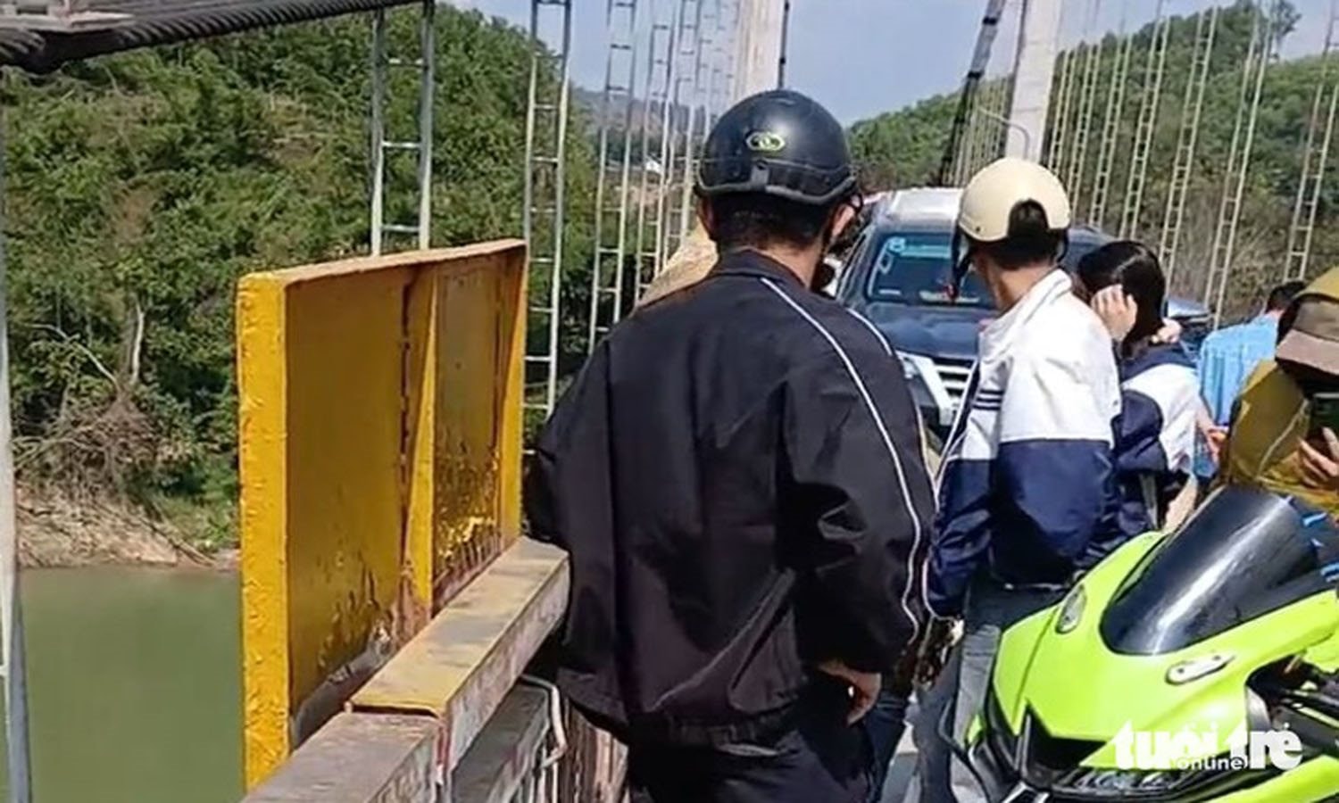 Người dân tập trung trên cầu treo theo dõi lực lượng chức năng xác minh thông tin nghi có người nhảy cầu.