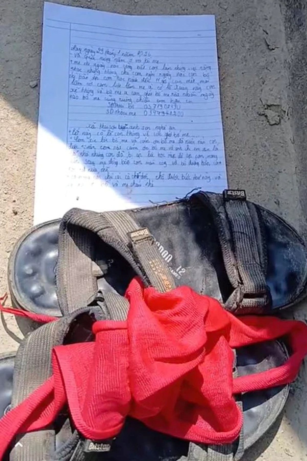 Đôi dép, khăn quàng đỏ và lá thư được người dân phát hiện bỏ lại trên cầu treo Đức Sơn.