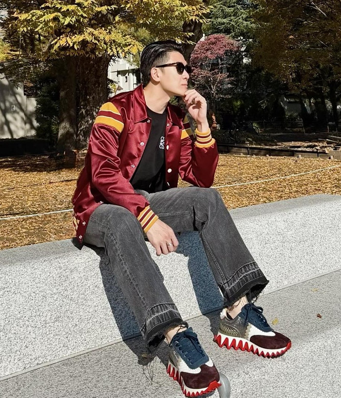 Trong bức ảnh trên trang cá nhân, doanh nhân Đỗ Quang Vinh phối đôi giày với quần jeans ống suông và áo phông đen, kết hợp cùng bomber đỏ khoác ngoài. Điểm nhấn là đế đỏ đặc trưng của món phụ kiện không chỉ là dấu ấn thương hiệu mà còn tạo hiệu ứng thị giác mạnh mẽ mỗi khi Đỗ Quang Vinh bước đi.