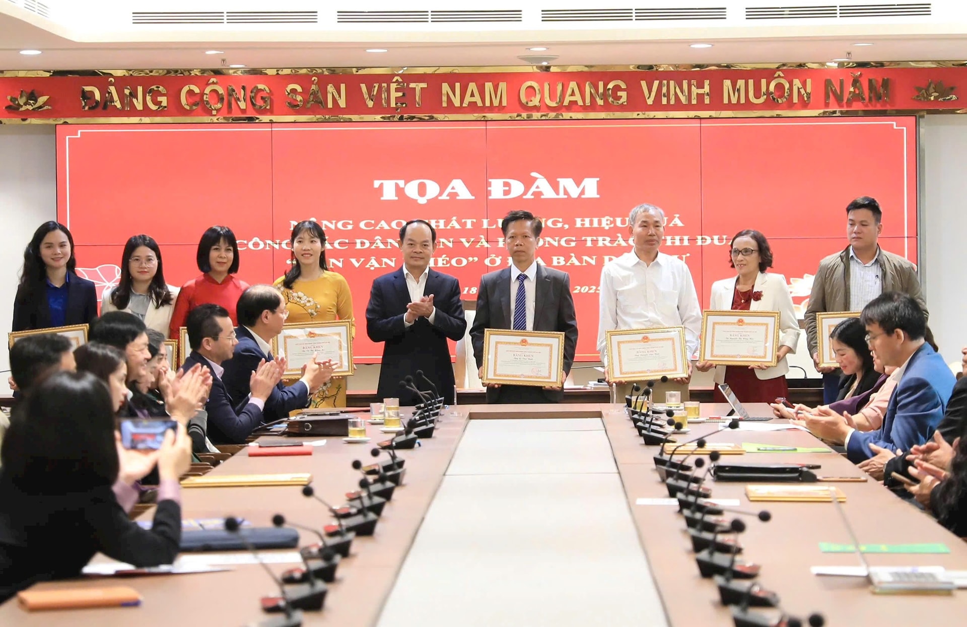 Trưởng ban Tuyên giáo và Dân vận Thành ủy Hà Nội Nguyễn Doãn Toản trao Bằng khen tặng các tập thể có thành tích xuất sắc. Ảnh: Quang Thái