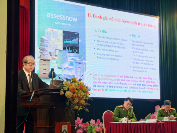Tại hội thảo, GS.TSKH Bành Tiến Long, nguyên Thứ trưởng Bộ Giáo dục và Đào tạo đã chia sẻ về những ưu điểm, hạn chế của mô hình kiểm định truyền thống, trên cơ sở đó đề xuất cần sớm chuyển dịch sang mô hình hiện đại. Đó là mô hình kiến tạo, dẫn dắt phát triển với việc ứng dụng, sử dụng AI trong đảm bảo và kiểm định chất lượng. Từ việc giới thiệu mô hình kiểm định chất lượng giáo dục đại học tiên tiến của các quốc gia trên thế giới như Hoa Kỳ, Châu Âu, Nhật Bản, GS.TSKH Bành Tiến Long cũng gợi mở hướng đi phù hợp cho các trường đại học tại Việt Nam nói chung, Trường Đại học PCCC nói riêng.
