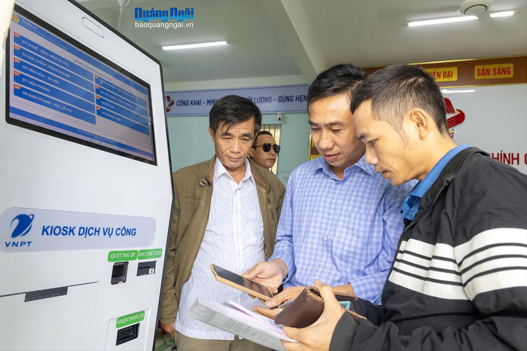 Cán bộ xã Đăk Hà hướng dẫn người dân sử dụng phần mềm xếp hàng trực tuyến để thực hiện thủ tục hành chính. ẢNH: NGUYỄN BAN