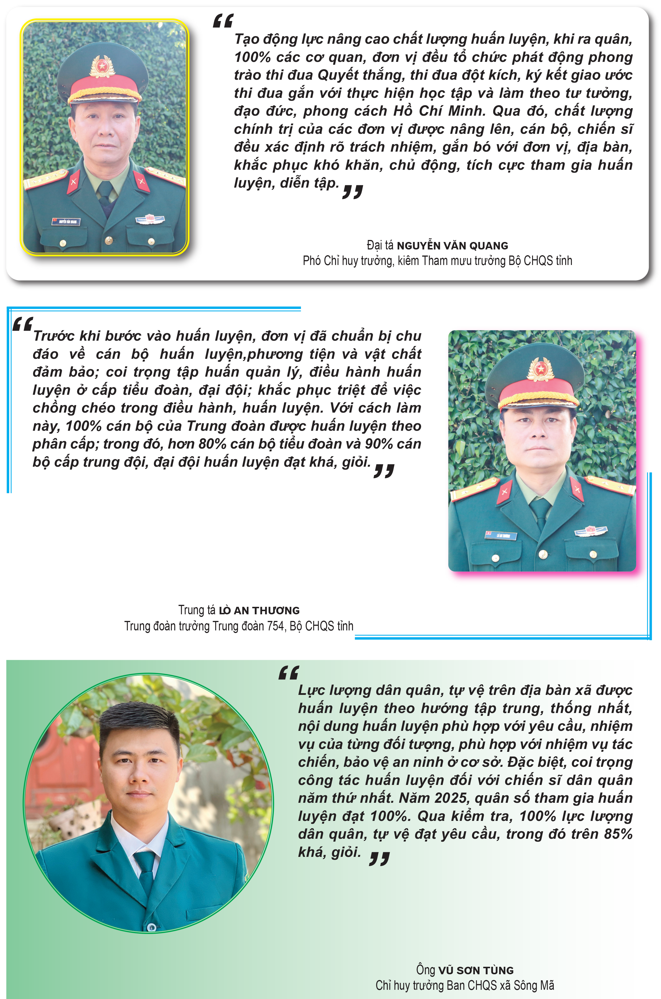 Diễn tập khu vực phòng thủ là nhiệm vụ quan trọng đối với cấp ủy, chính quyền địa phương các cấp, Đảng ủy, Bộ CHQS tỉnh tham mưu cho Tỉnh ủy, UBND tỉnh lãnh đạo, chỉ đạo cả hệ thống chính trị vào cuộc, cùng thực hiện nhiệm vụ. Từ đầu năm đến nay, đã tổ chức thành công diễn tập điểm phòng thủ khu vực 3 - Mai Sơn, diễn tập chỉ huy, cơ quan 1 bên, 1 cấp có một phần thực binh tại Trung đoàn 754; diễn tập phòng thủ dân sự huyện Sốp Cộp, Mộc Châu cũ; diễn tập chỉ huy, cơ quan 1 bên, 1 cấp về động viên huyện Sông Mã cũ và nhiều cuộc diễn tập chiến đấu trong khu vực phòng thủ cấp xã. Các cuộc diễn tập đều bảo đảm an toàn tuyệt đối về người, vũ khí, trang thiết bị, góp phần nâng cao trình độ tham mưu, chỉ huy hiệp đồng tác chiến của các lực lượng, đáp ứng yêu cầu nhiệm vụ sẵn sàng chiến đấu trong các tình huống.