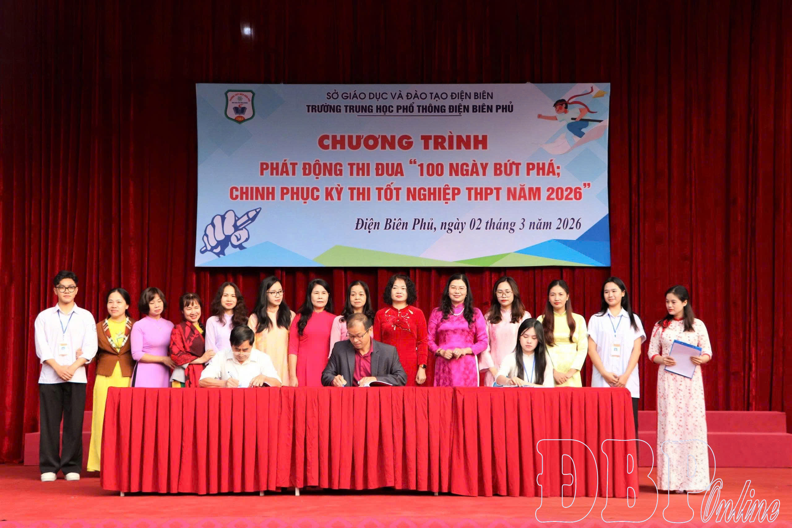 Đại diện Trường THPT Điện Biên Phủ, hội phụ huynh và học sinh ký cam kết thi đua “100 ngày bứt phá, chinh phục kỳ thi tốt nghiệp THPT năm 2026”.
