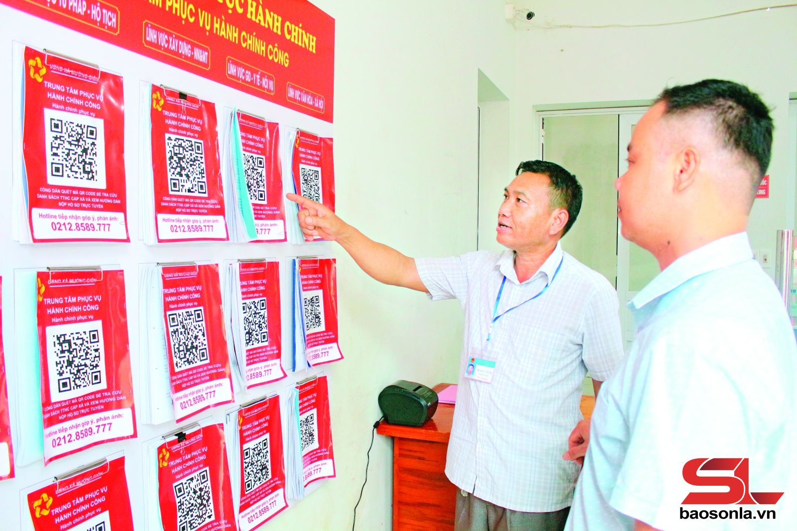 Cán bộ Trung tâm Phục vụ hành chính công xã Mường Giôn hướng dẫn nhân dân tra cứu thủ tục hành chính bằng QR-Code