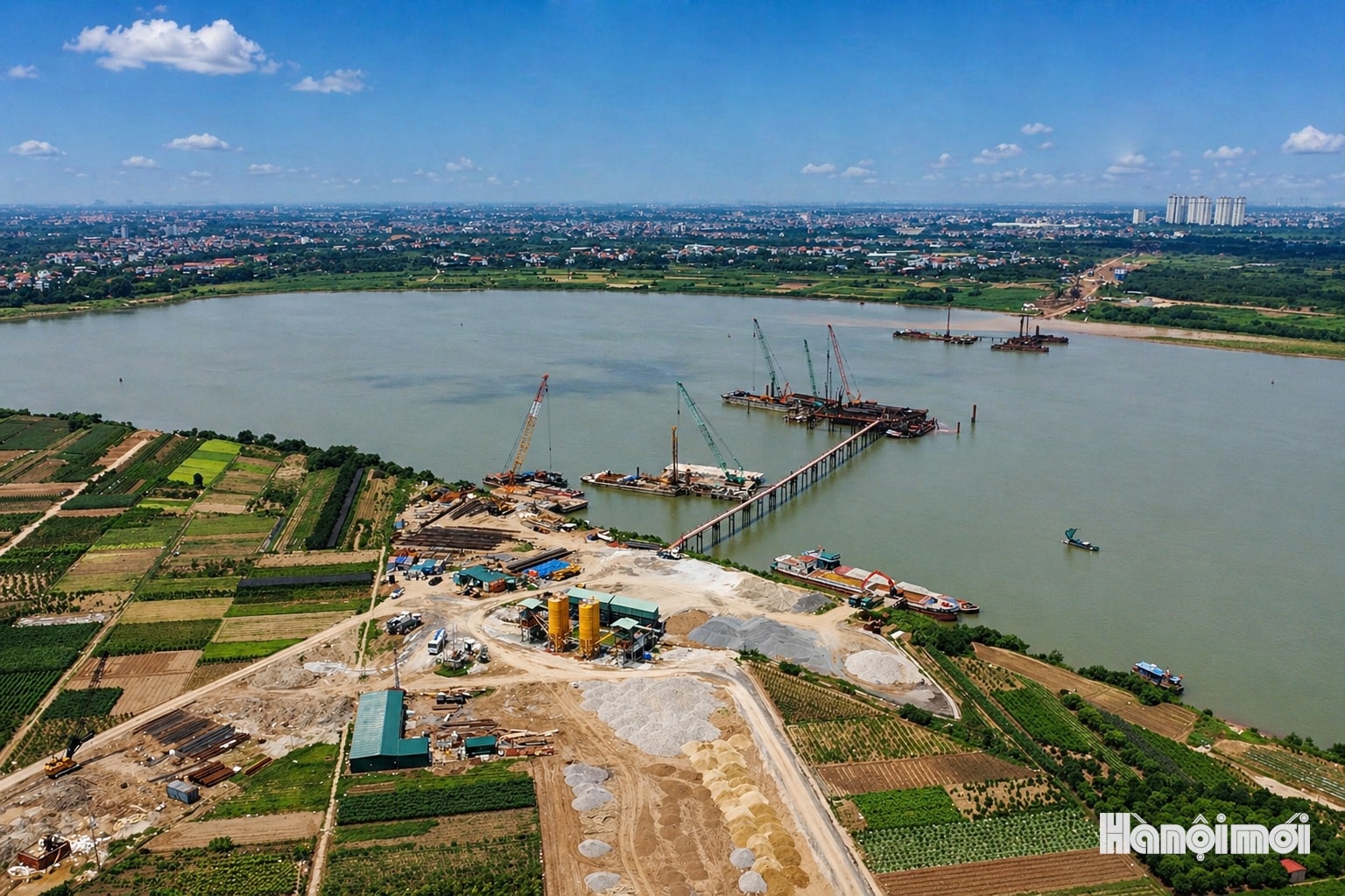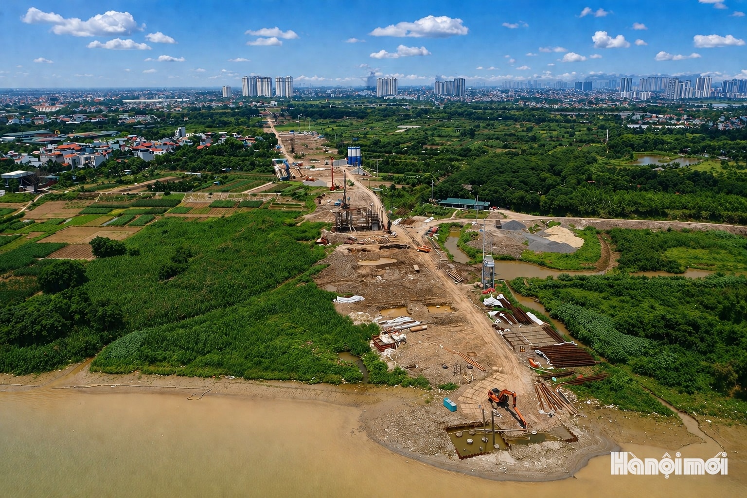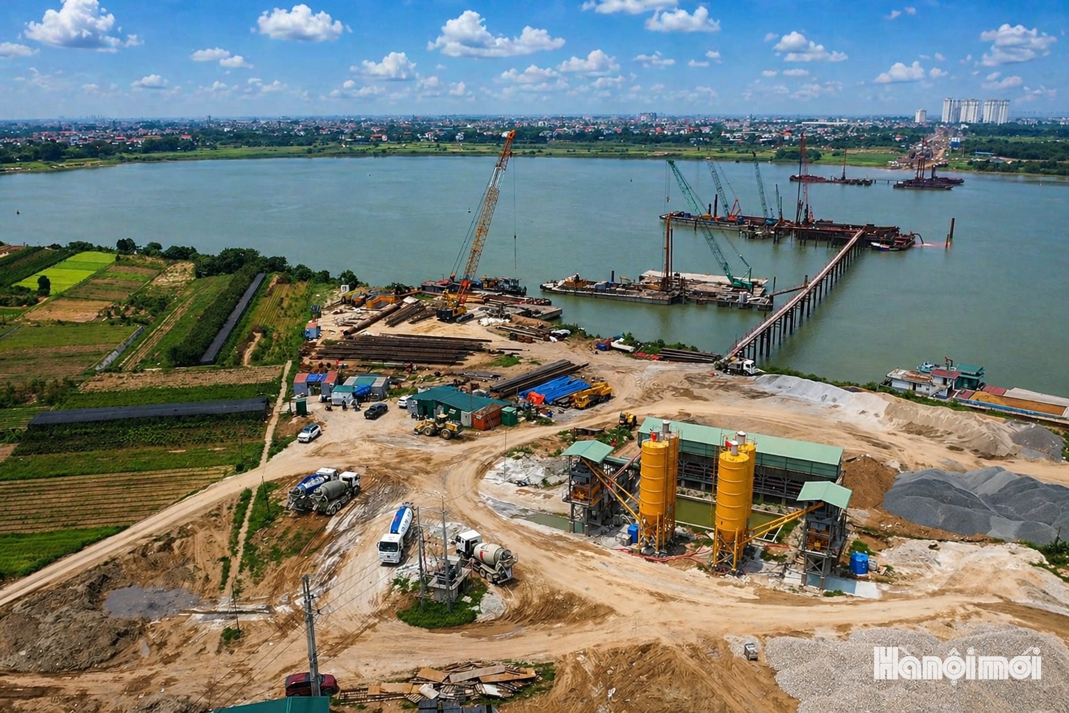 Toàn cảnh công trường thi công cầu Ngọc Hồi và đường dẫn 2 đầu cầu tại khu vực ven sông Hồng, đoạn qua địa bàn xã Bát Tràng và xã Thanh Trì.