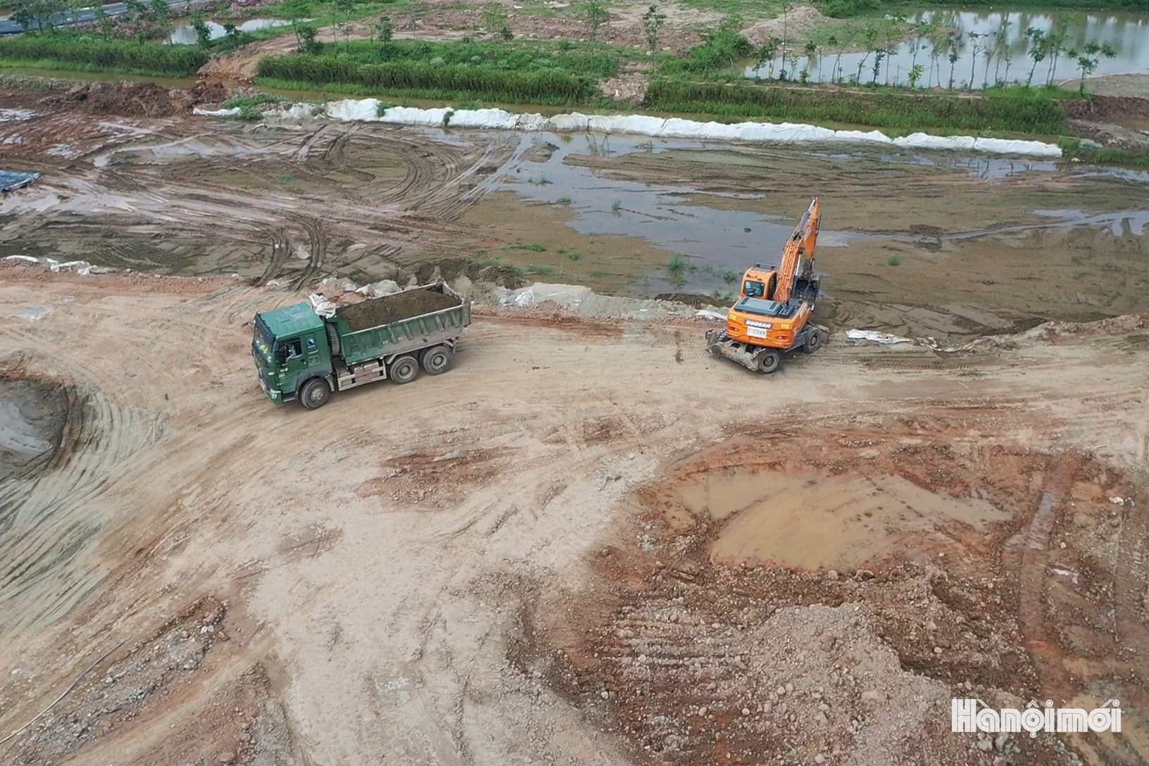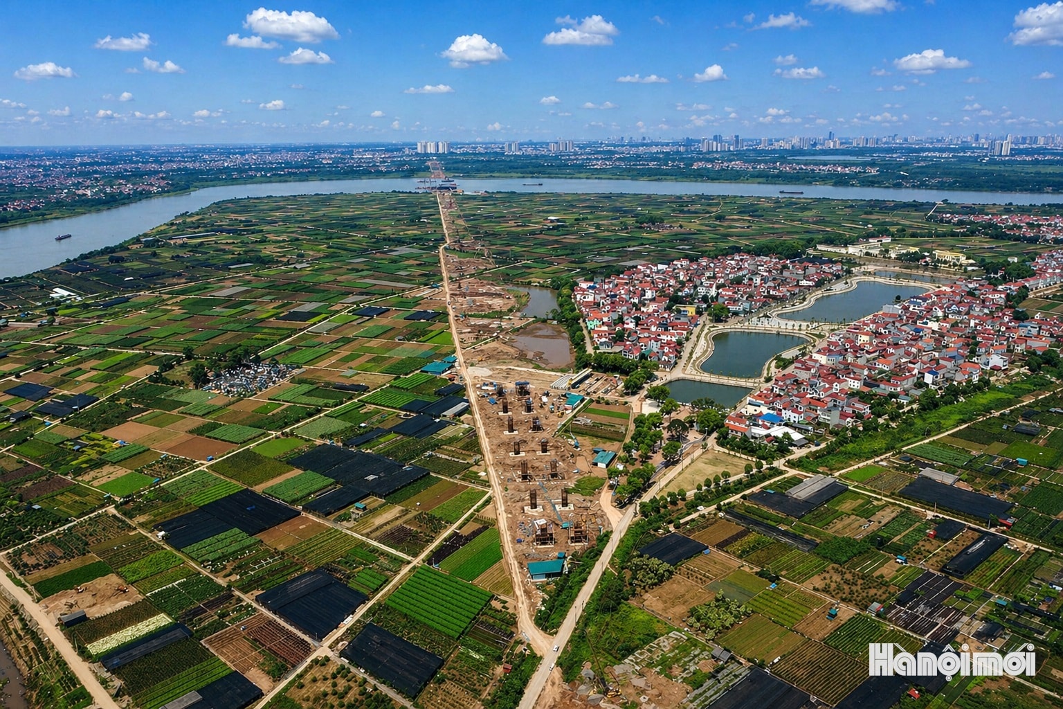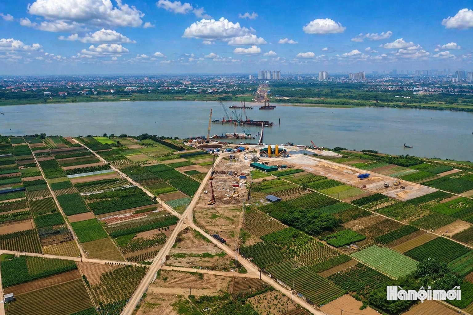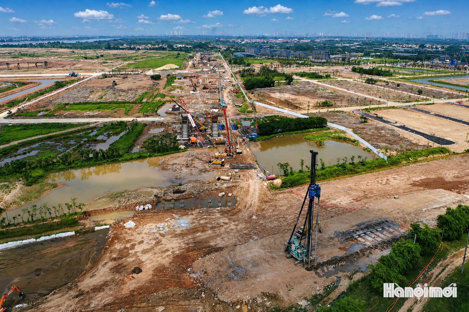 Toàn cảnh công trường thi công cầu Ngọc Hồi và đường dẫn 2 đầu cầu tại khu vực ven sông Hồng, đoạn qua địa bàn xã Bát Tràng và xã Thanh Trì.