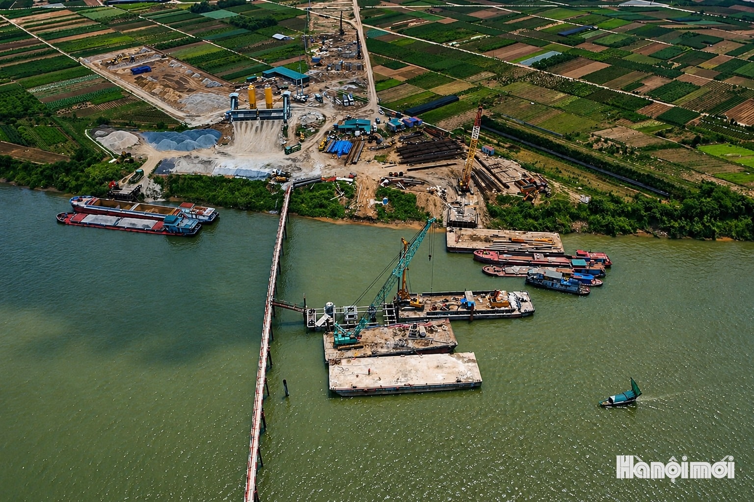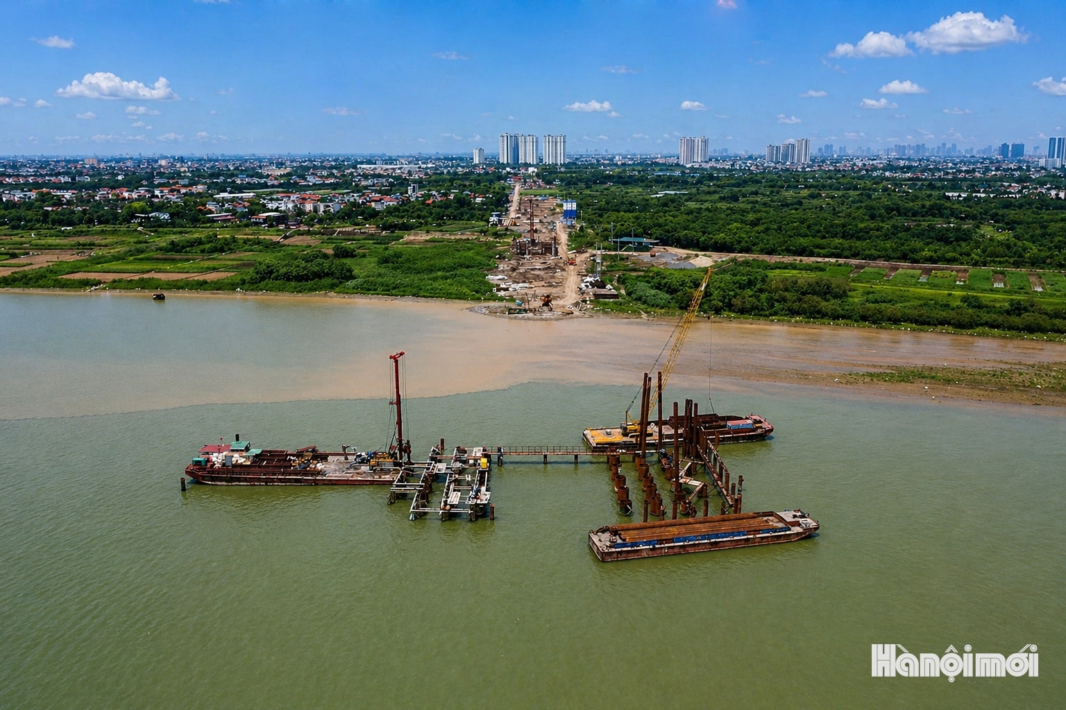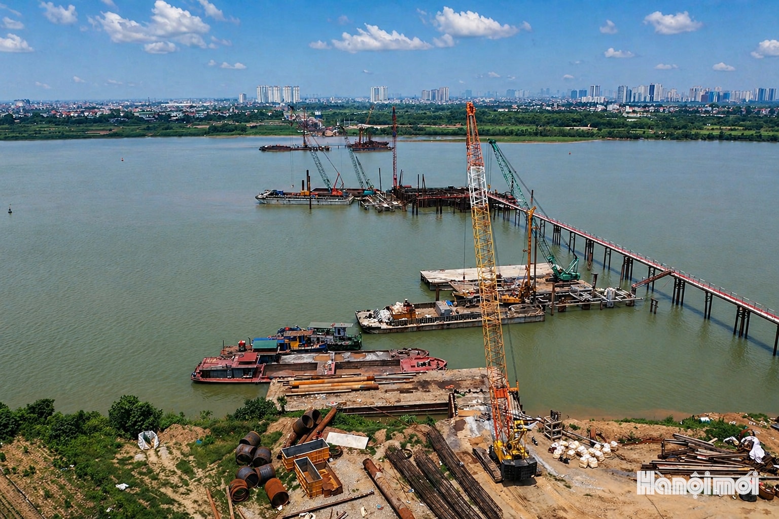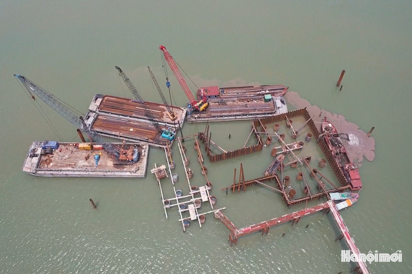 Hiện tại, hệ thống máy khoan cọc nhồi cỡ lớn được triển khai trên lòng sông Hồng, phục vụ thi công các trụ chính của cầu Ngọc Hồi.