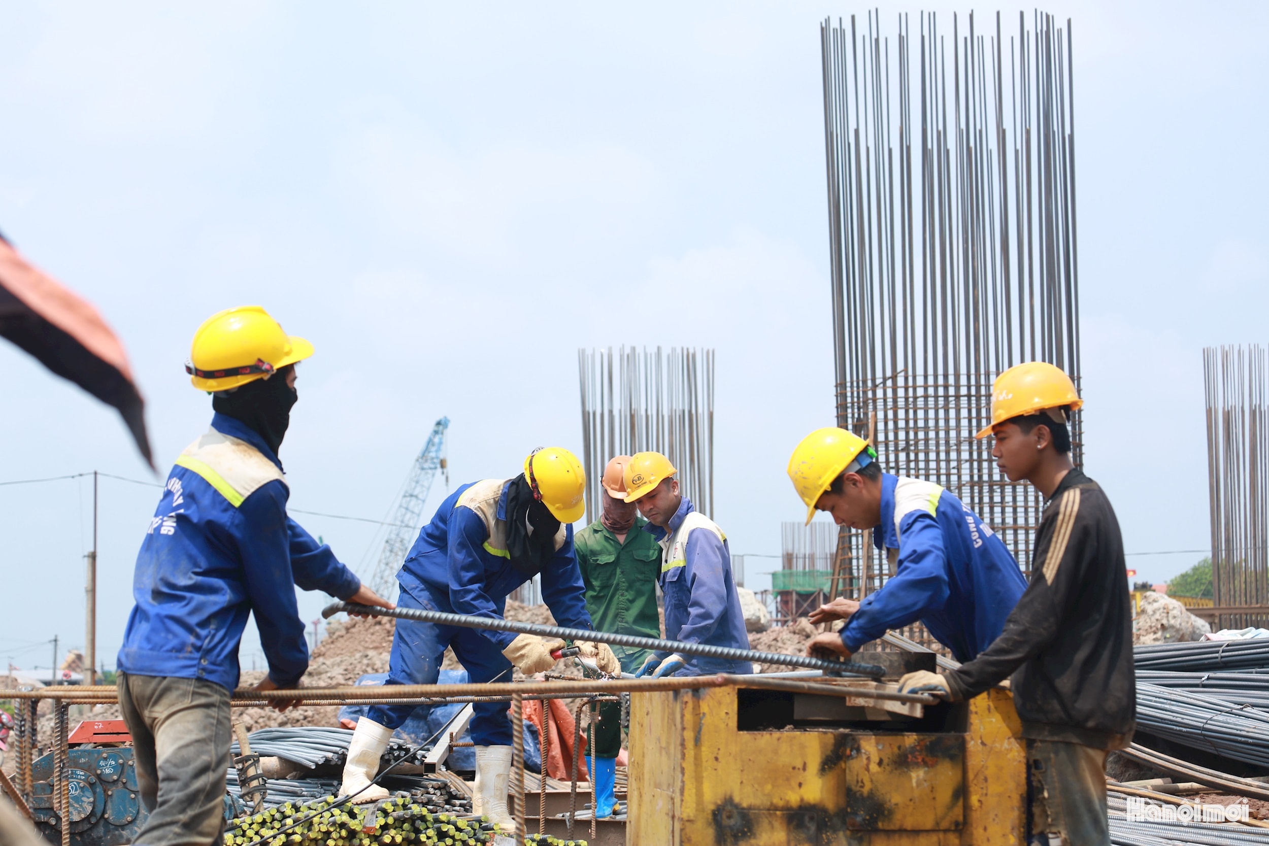 Công nhân "đội nắng" thi công các cấu kiện bằng sắt phục vụ đổ dầm trụ cầu cạn đường dẫn 2 đầu cầu của dự án.