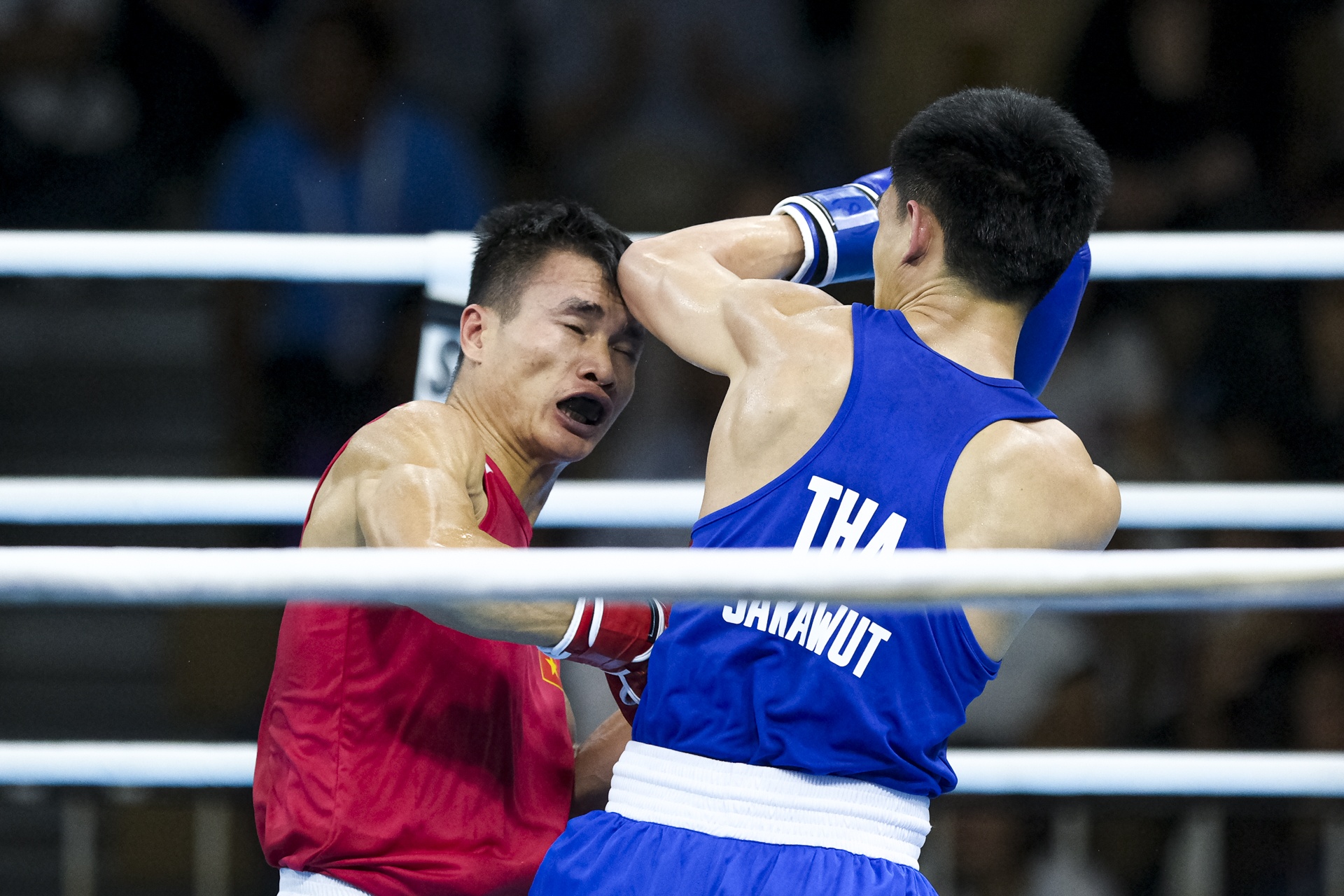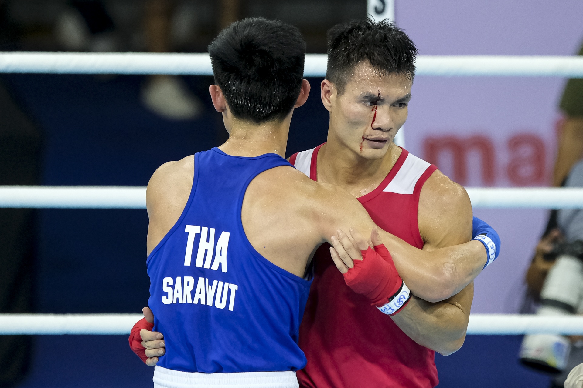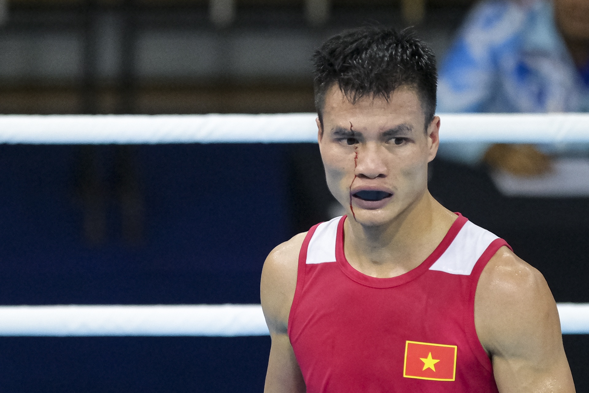 Đỉnh điểm là đầu hiệp đấu thứ 3, võ sĩ Việt Nam bị rách phần trán, máu chảy nhiều, trọng tài tạm dừng trận đấu để y tế chăm sóc.