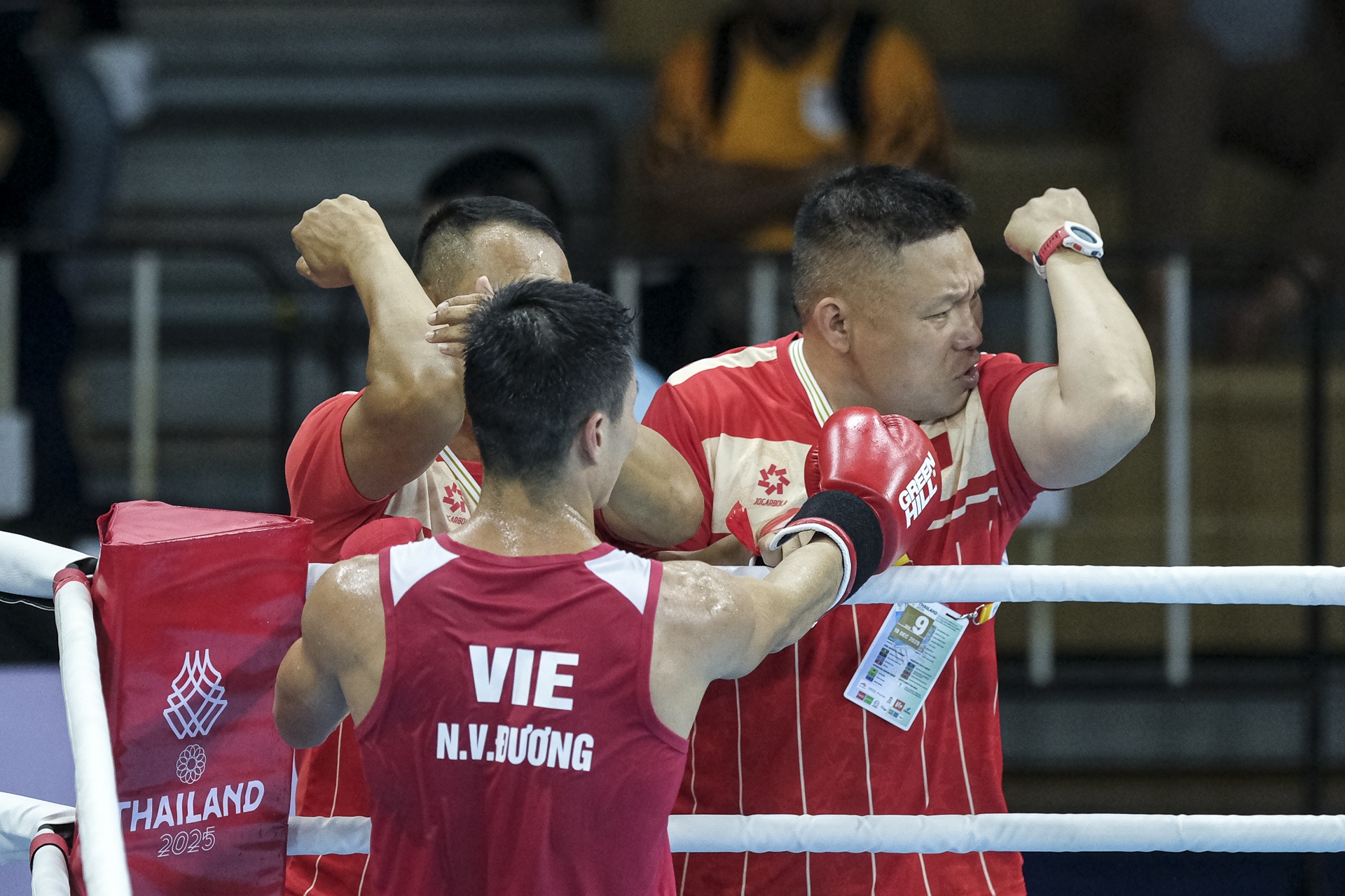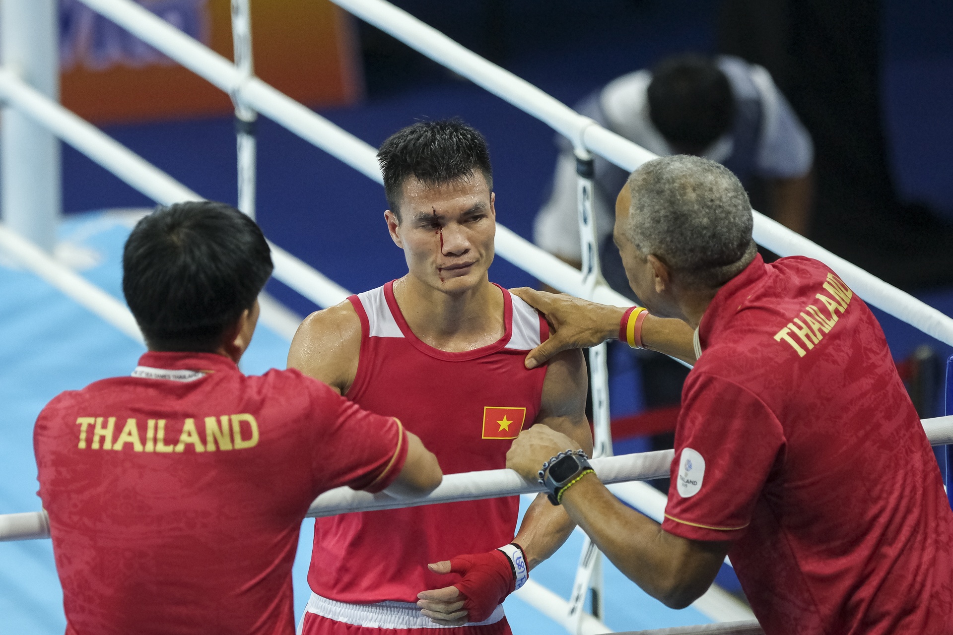 Ban huấn luyện Thái Lan động viên, giải thích với võ sĩ Việt Nam sau tình huống anh bị chảy máu và xử thua.