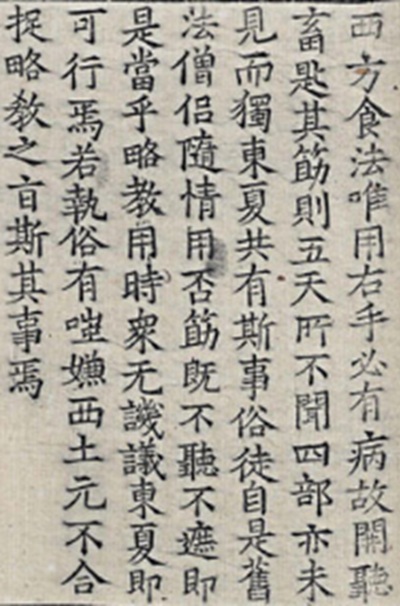 Hán văn: Tây phương thực pháp duy dụng hữu thủ, tất hữu bệnh cố khai thính súc thi, kì trợ tắc Ngũ Thiên sở bất văn,Tứ Bộ diệc vị kiến, nhi độc Đông Hạ cộng hữu tư sự, tục đồ tự thị cựu pháp, tăng lữ tùy tình dụng phủ. Trợ kí bất thính bất già, tức thị đương hồ Lược Giáo. Thì chúng vô ki nghị, Đông Hạ tức khả hành yên; nhược chấp tục hữu xi hiềm, tây thổ nguyên bất hợp tróc. Lược Giáo chi chỉ, tư kì sự yên.