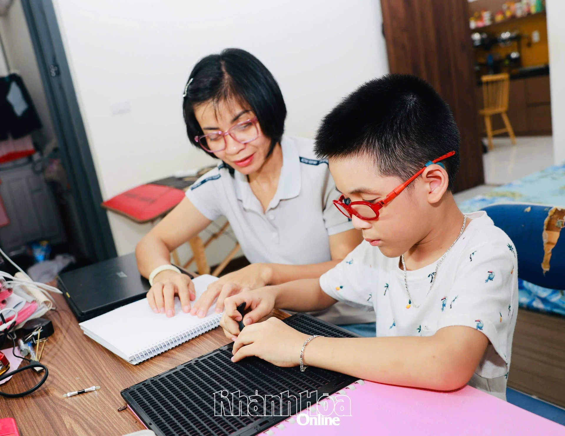 Để có được điều đó, gia đình bà Dung đã phải tự mình mở từng cánh cửa. Họ nhờ người dạy chữ nổi cho con, liên hệ Trường Nguyễn Đình Chiểu ở Hà Nội và TP. Hồ Chí Minh để mượn sách giáo khoa; rồi khi không mượn được vì khác chương trình, gia đình đã tự đặt in sách chữ nổi từ TP. Hồ Chí Minh cho con học. Năm Hùng học lớp 2, qua sự giới thiệu của Hội Người mù tỉnh Khánh Hòa, gia đình kết nối được với bà Đậu Hương Giang - một người khiếm thị đã tận tình dạy kèm miễn phí cho Hùng. Không chỉ dạy chữ, bà Giang còn tìm kiếm bài giảng, nâng cao kiến thức cho em từng ngày. "Tôi muốn cộng đồng nhìn nhận rằng người khiếm thị vẫn có thể học tập, làm việc hữu ích cho xã hội", bà Giang chia sẻ. Trên nét mặt của người phụ nữ ấy, tôi thấy cả một hành trình dài mà bà đã đi qua, giờ đang trao lại cho thế hệ sau.