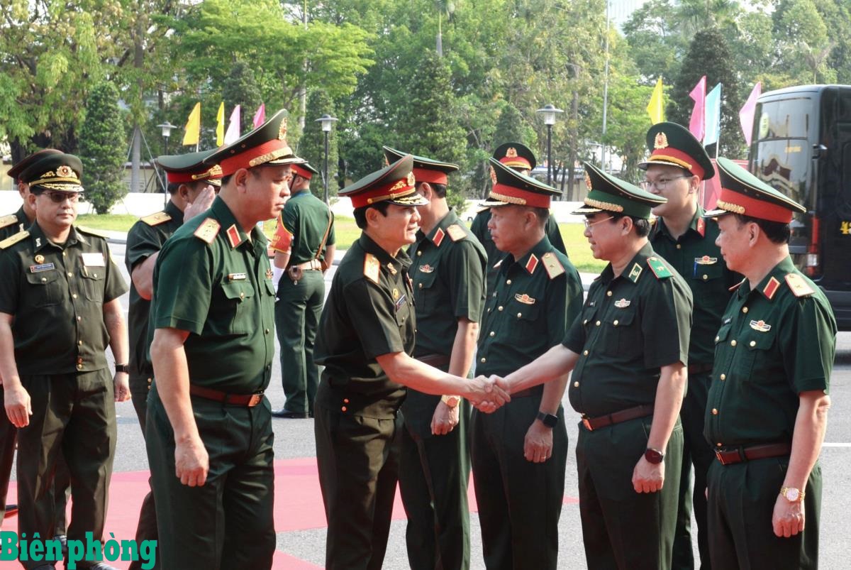 Thượng tướng Nguyễn Trường Thắng cùng đoàn đại biểu Việt Nam chào đón Thượng tướng Saichay Kommasith về dự đối thoại. Ảnh: Hồng Pha