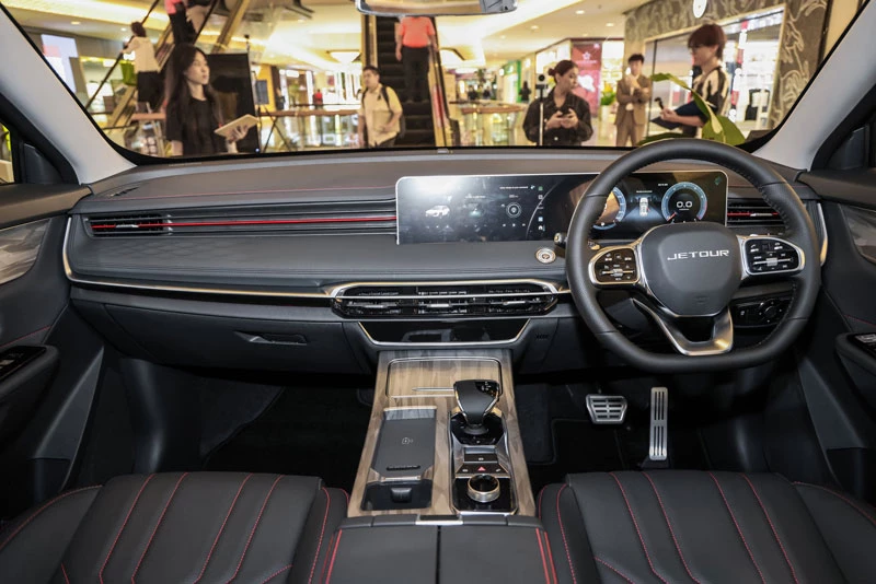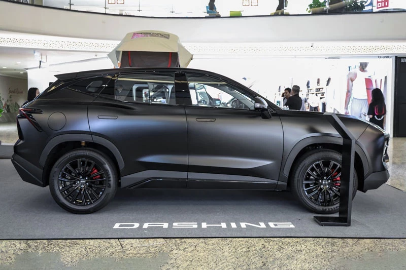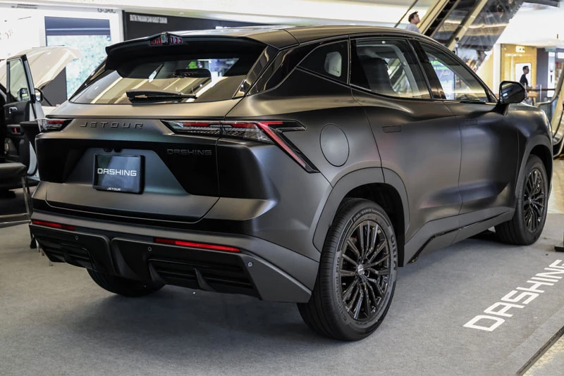 Điểm nhấn nổi bật nhất của Jetour Dashing Dark Warrior Limited Edition nằm ở lớp sơn ngoại thất màu đen mờ đầy bí ẩn, kết hợp với logo Jetour phía trước và phía sau đều được sơn đen, tạo nên tổng thể đồng nhất và mạnh mẽ. Các chi tiết như biểu tượng “Dashing” và bộ mâm hợp kim Phantom Spec kích thước 19 inch (đi kèm lốp 235/55) cũng được thiết kế riêng cho phiên bản này, góp phần tăng thêm vẻ thể thao. Đặc biệt, kẹp phanh màu đỏ tạo điểm nhấn tương phản, giúp chiếc SUV trở nên nổi bật hơn trên đường sá.