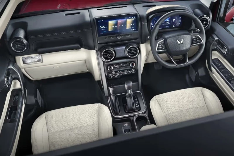 Bên trong cabin, Mahindra Thar Roxx được nâng cấp mạnh mẽ về chất liệu và công nghệ. Khoang lái sử dụng vật liệu mềm mại kết hợp chi tiết kim loại đen hoặc kim loại chải xước, mang lại cảm giác cao cấp hơn. Xe được trang bị màn hình cảm ứng giải trí trung tâm 10,25 inch hỗ trợ Android Auto và Apple CarPlay không dây, cùng bảng đồng hồ kỹ thuật số 10,25 inch hiển thị trực quan.