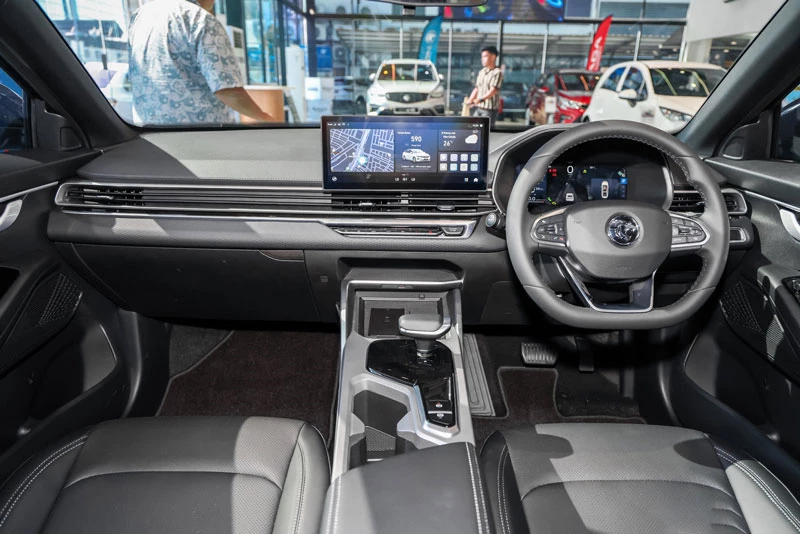 Bên trong khoang lái, nội thất Proton S70 2026 gần như giữ nguyên bố cục quen thuộc với bảng táp-lô tối giản, cửa gió điều hòa kéo dài toàn chiều ngang và cần số điện tử hình chữ T. Riêng Flagship X được bổ sung trần xe màu đen, tạo cảm giác thể thao hơn, trong khi các bản còn lại vẫn sử dụng tông màu be.