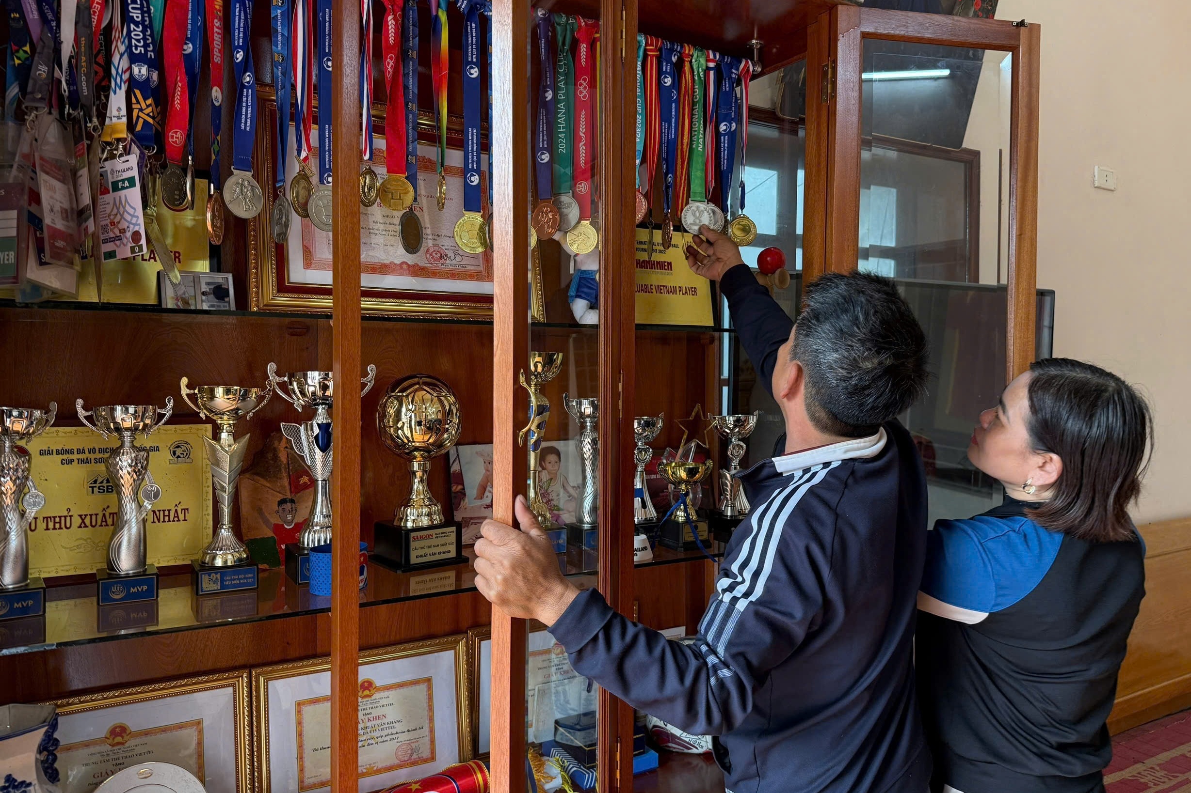 Chiếc tủ kính treo đầy huy chương, bằng khen của đội trưởng U23 Việt Nam tại quê nhà Phúc Lộc. Ảnh: Châu Sa.