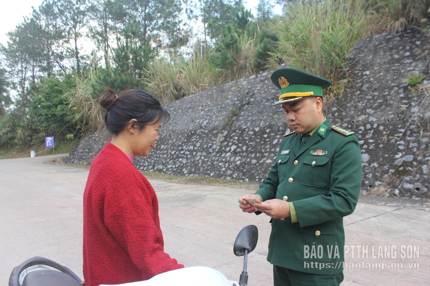 Đại úy Nguyễn Văn Thưởng kiểm tra giấy tờ và tuyên truyền pháp luật đến người dân xã Kiên Mộc